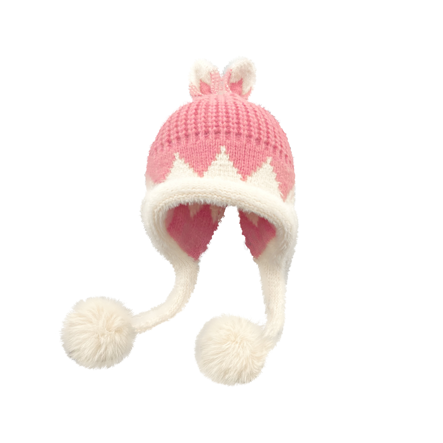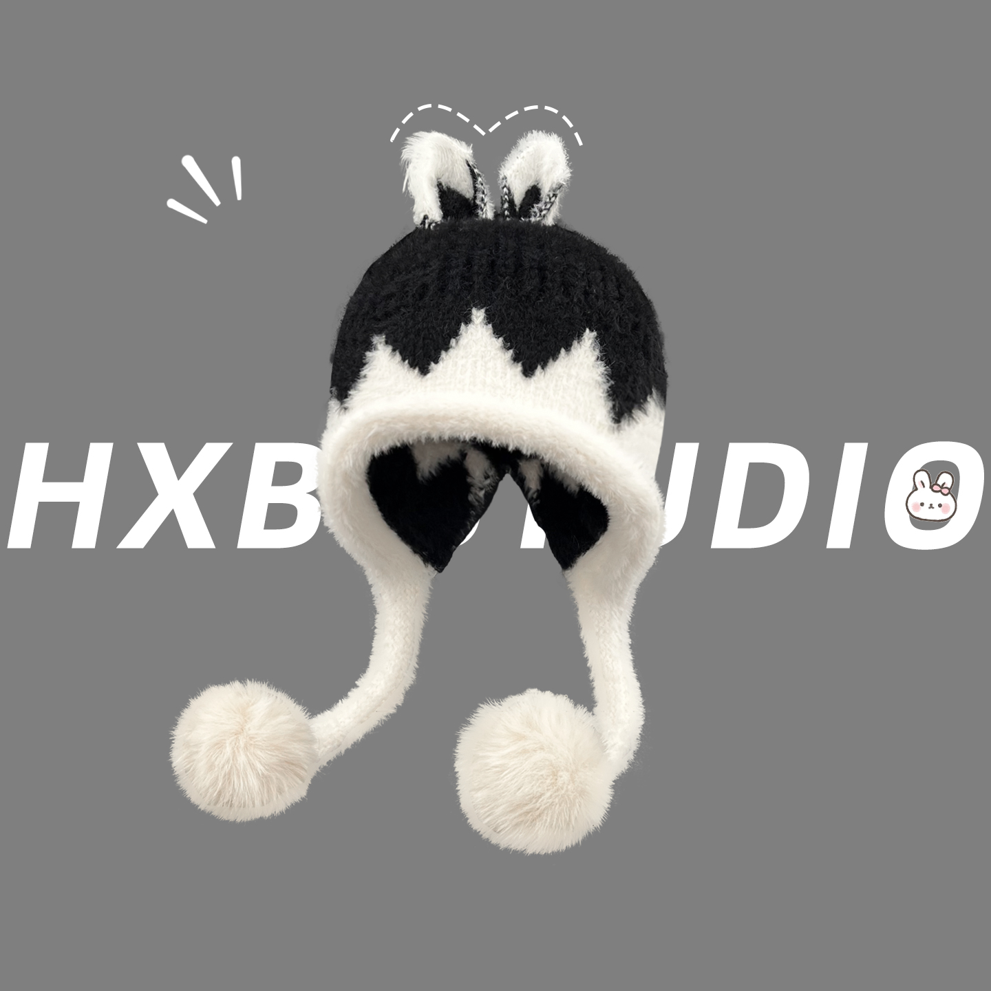 可爱小兔子球球针织毛线帽女秋冬出游甜美保暖绑带护耳百搭雷锋帽