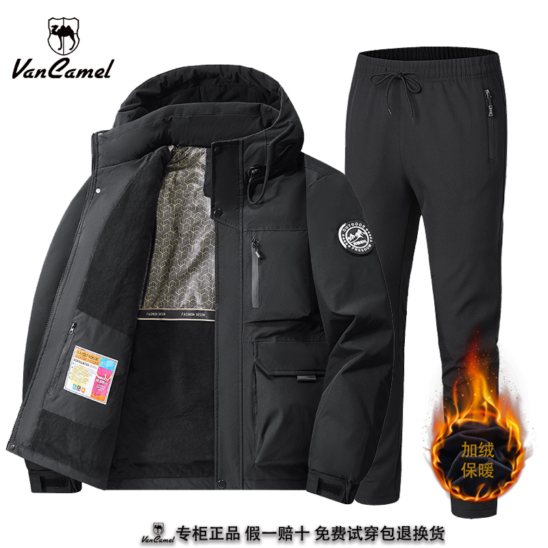 西域骆驼户外套装冲锋外套男士秋冬款加绒加厚防风保暖衣裤两件套