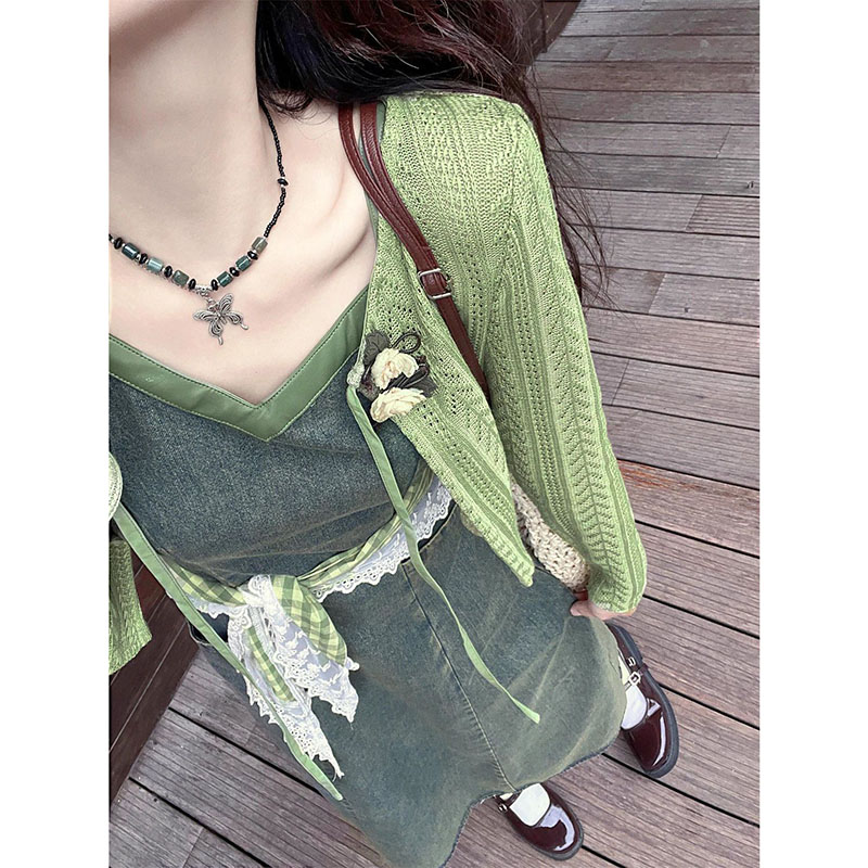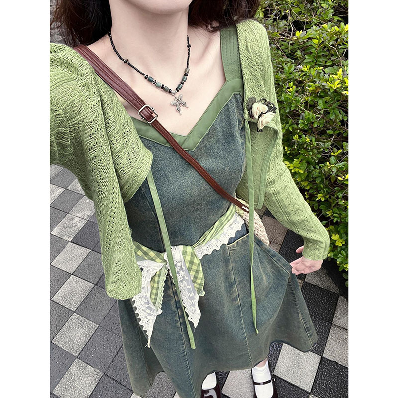 森系复古温柔风水洗做旧牛仔背带连衣裙女搭配绿色防晒衫两件套装