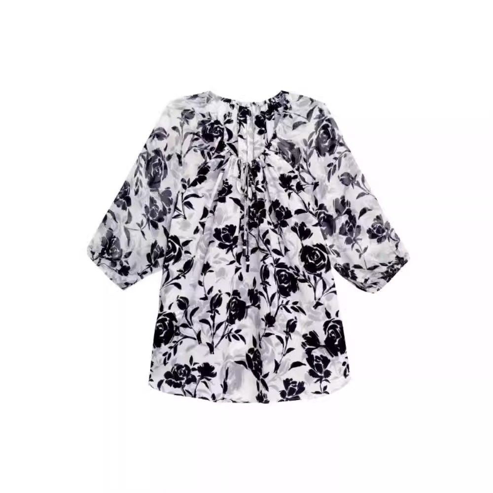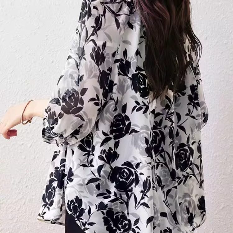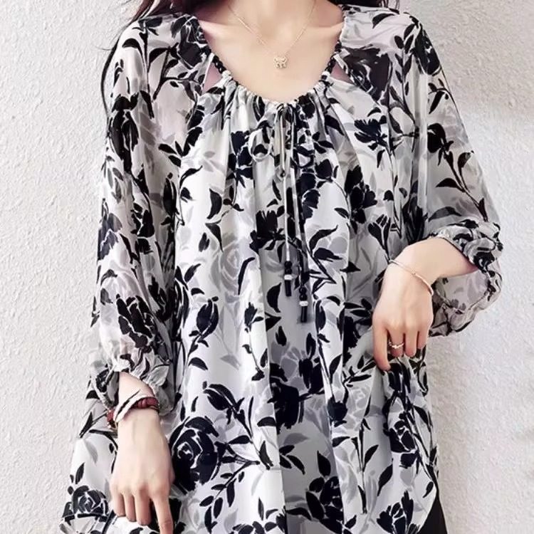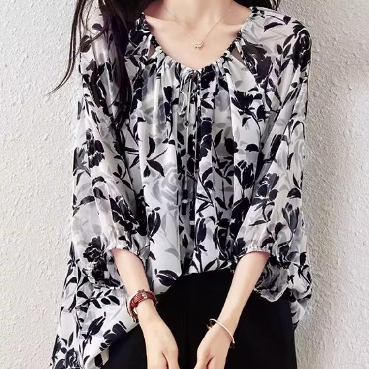 特大码洋气时髦宽松遮肉显瘦七分袖印花雪纺衫中袖上衣女夏300斤