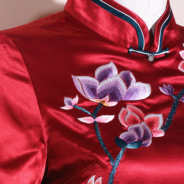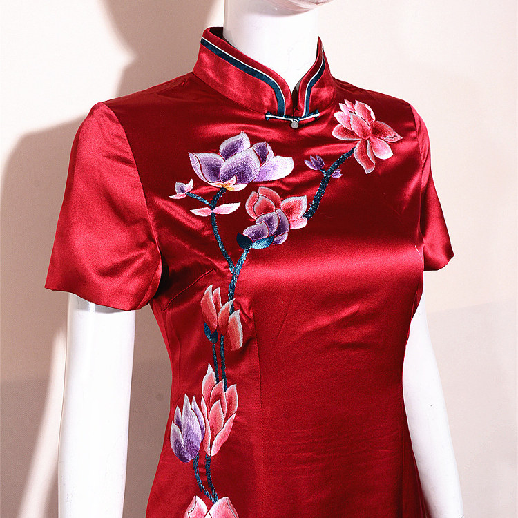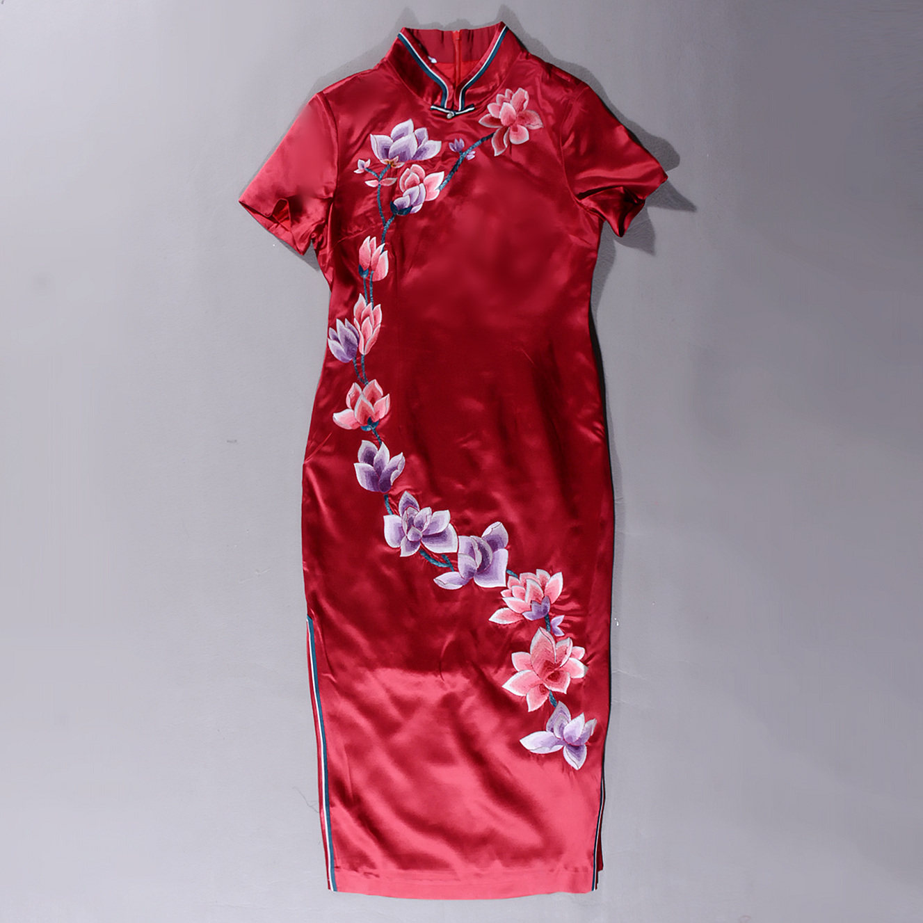 (捡漏M-3XL)素罗Y2025夏季桑蚕丝重工刺绣挂里真丝旗袍酒红尾货