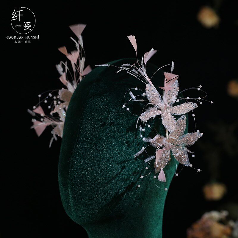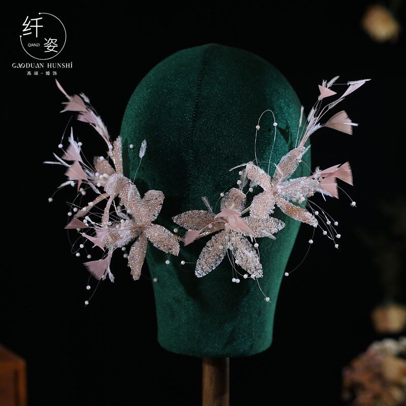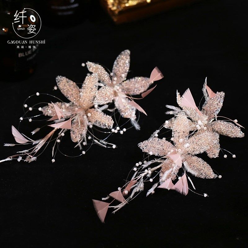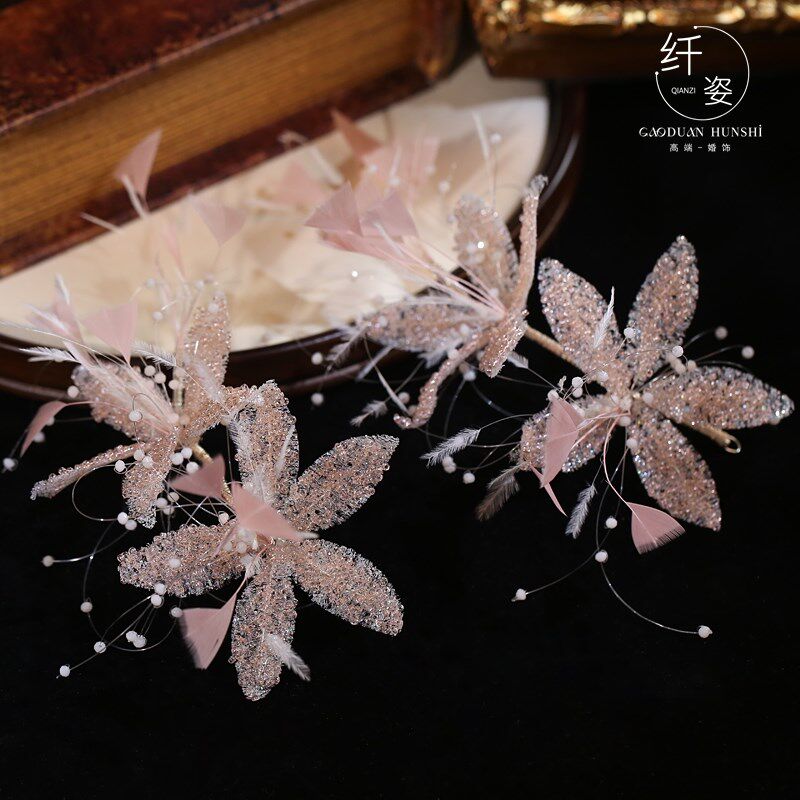 精致手作仙女粉色碎钻花瓣新娘羽毛头饰减龄韩系跟妆婚纱礼服发饰