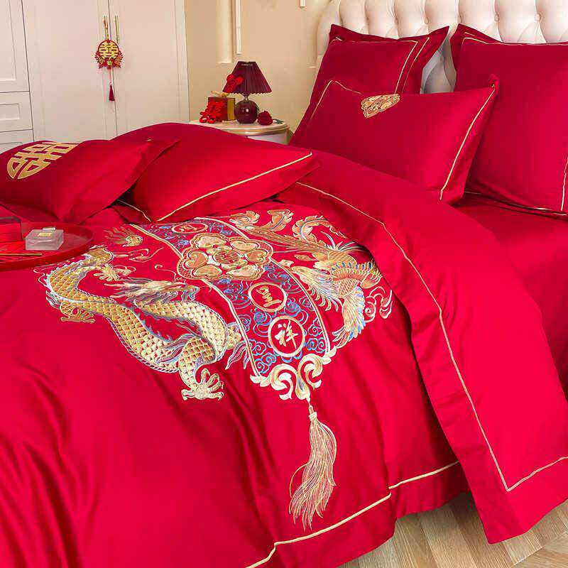 中式龙凤刺绣大红色婚庆四件套新婚陪嫁床单被套喜被结婚床上用品