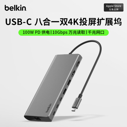 belkin贝尔金8合1扩展坞高清HDMI双屏4K千兆网口typec拓展坞高速数据传输适用Macbook笔记本M1/M2/M3电脑ipad