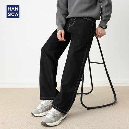 hansca黑色牛仔裤男款直筒宽松阔腿2025新款秋季青少年水洗长裤子