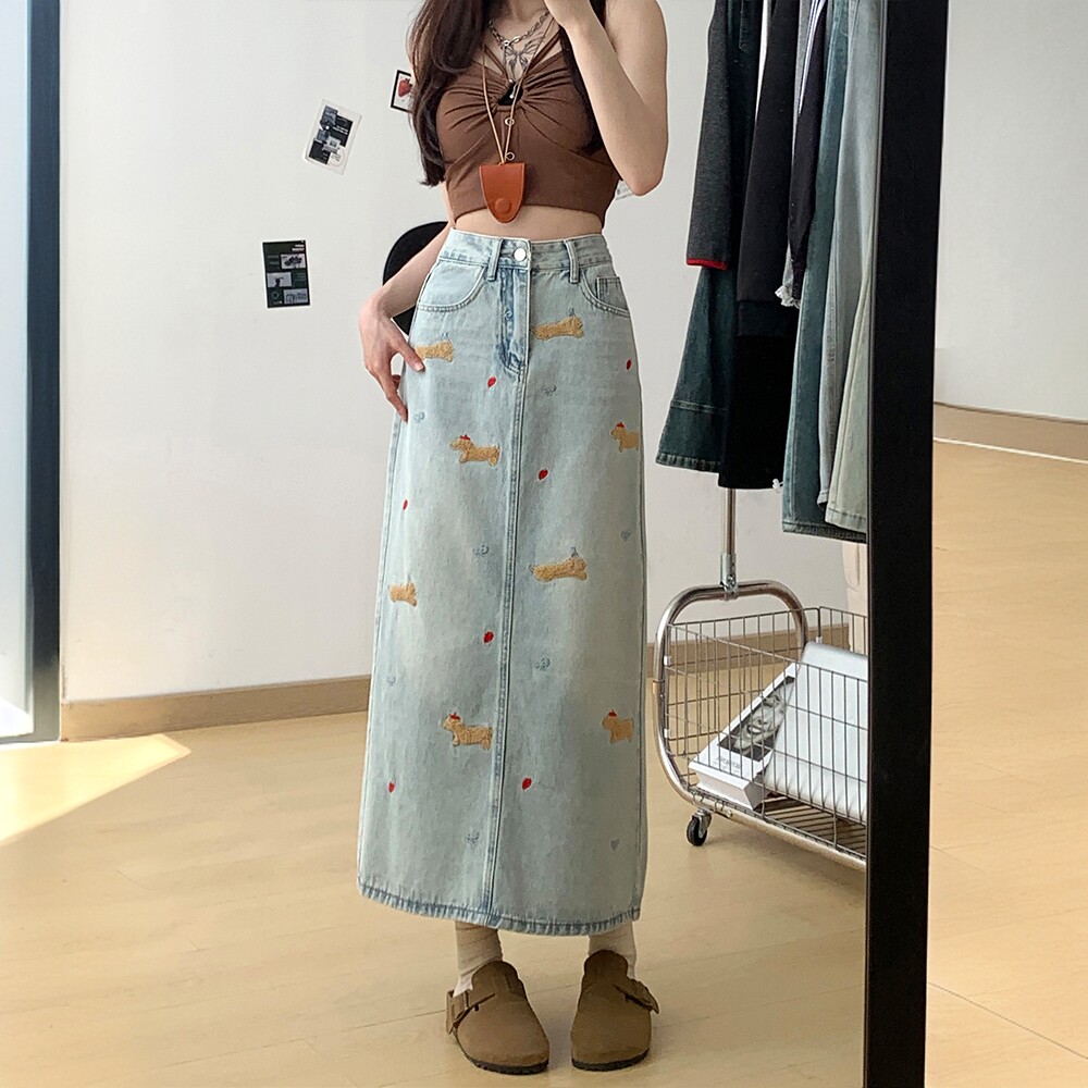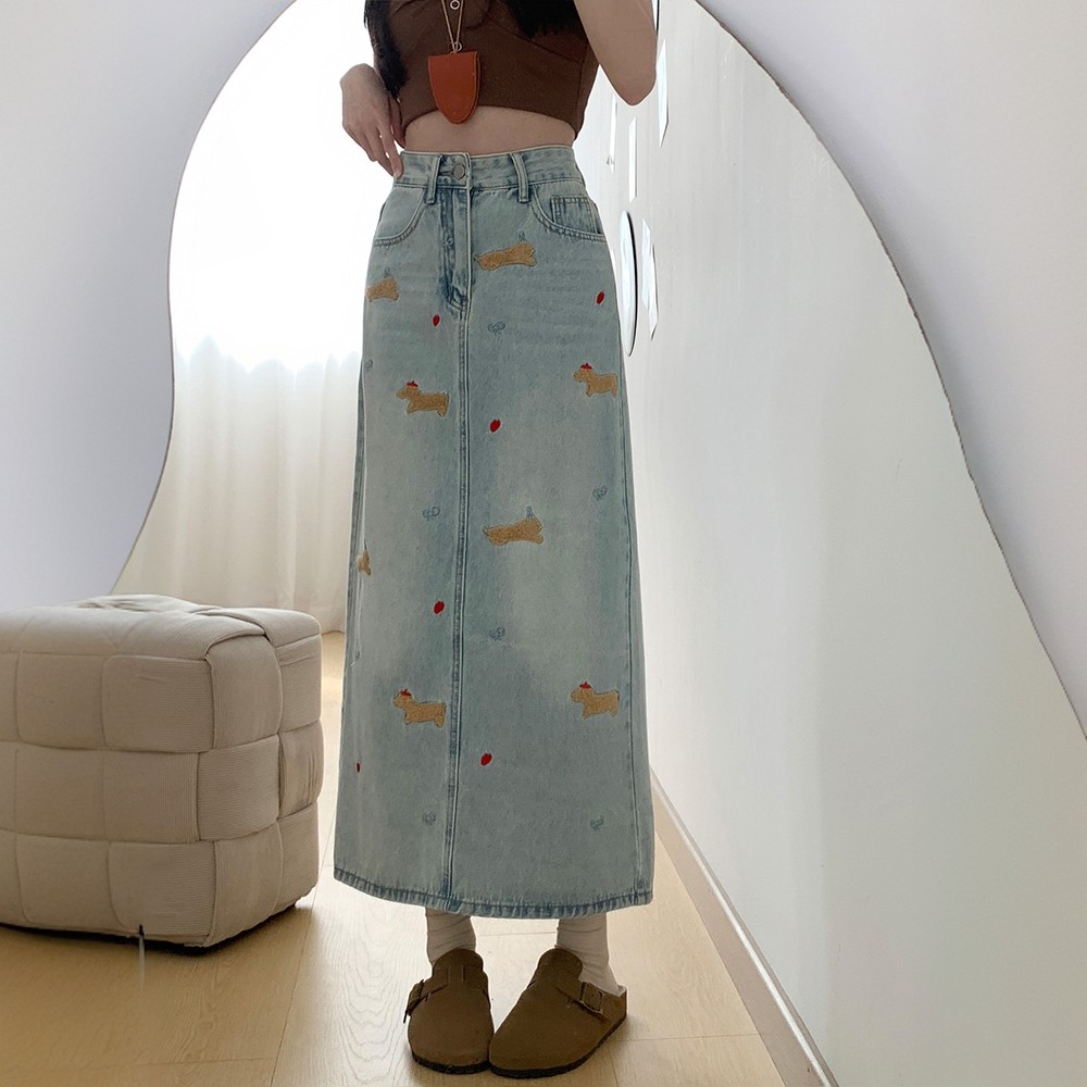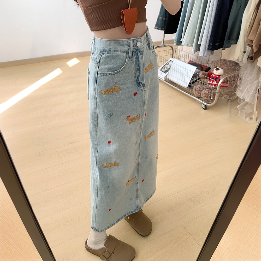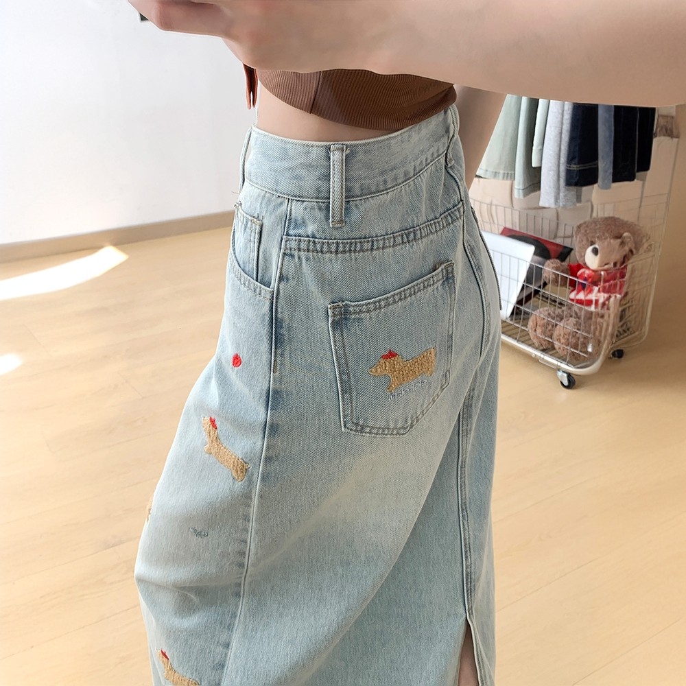 300斤大码女装复古趣味小狗刺绣牛仔半身裙高腰开叉设计显瘦长裙