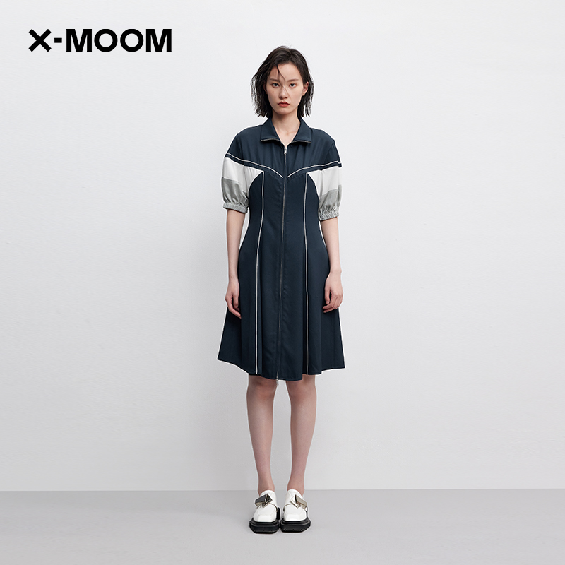 【商场同款】X--MOOM夏季新款撞色拼接收腰垂感醋酸中长连衣裙女