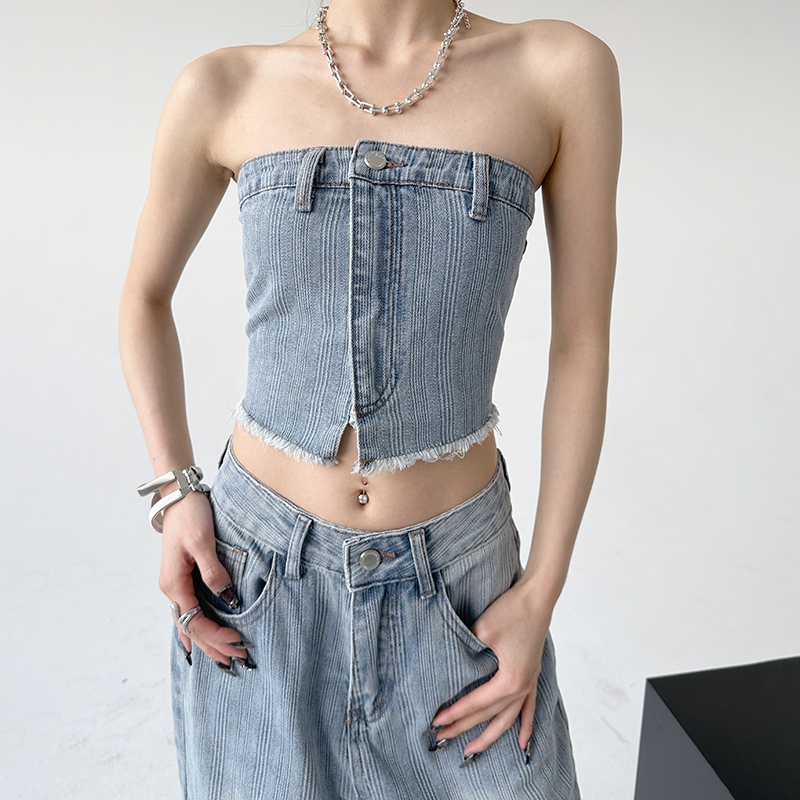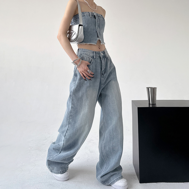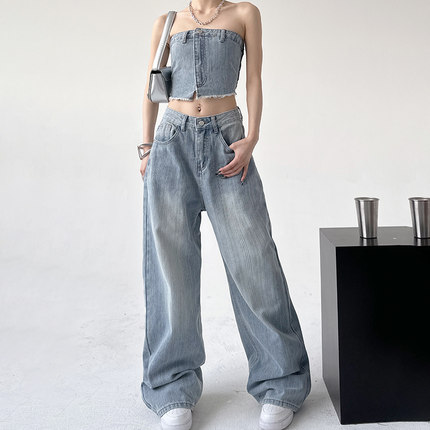 洗水浅蓝牛仔抹胸长裤套装女春秋季2025新款宽松直筒牛仔裤