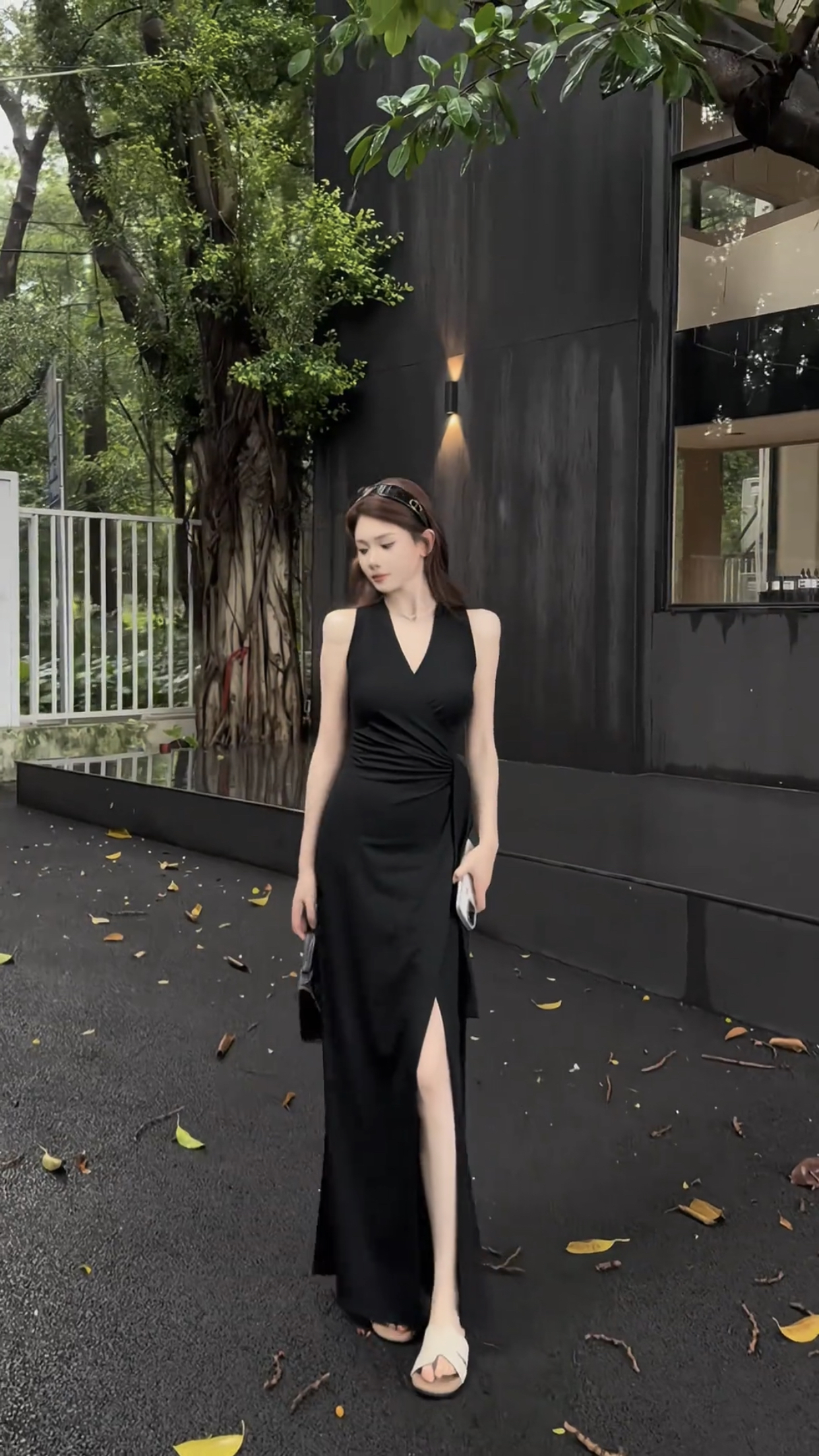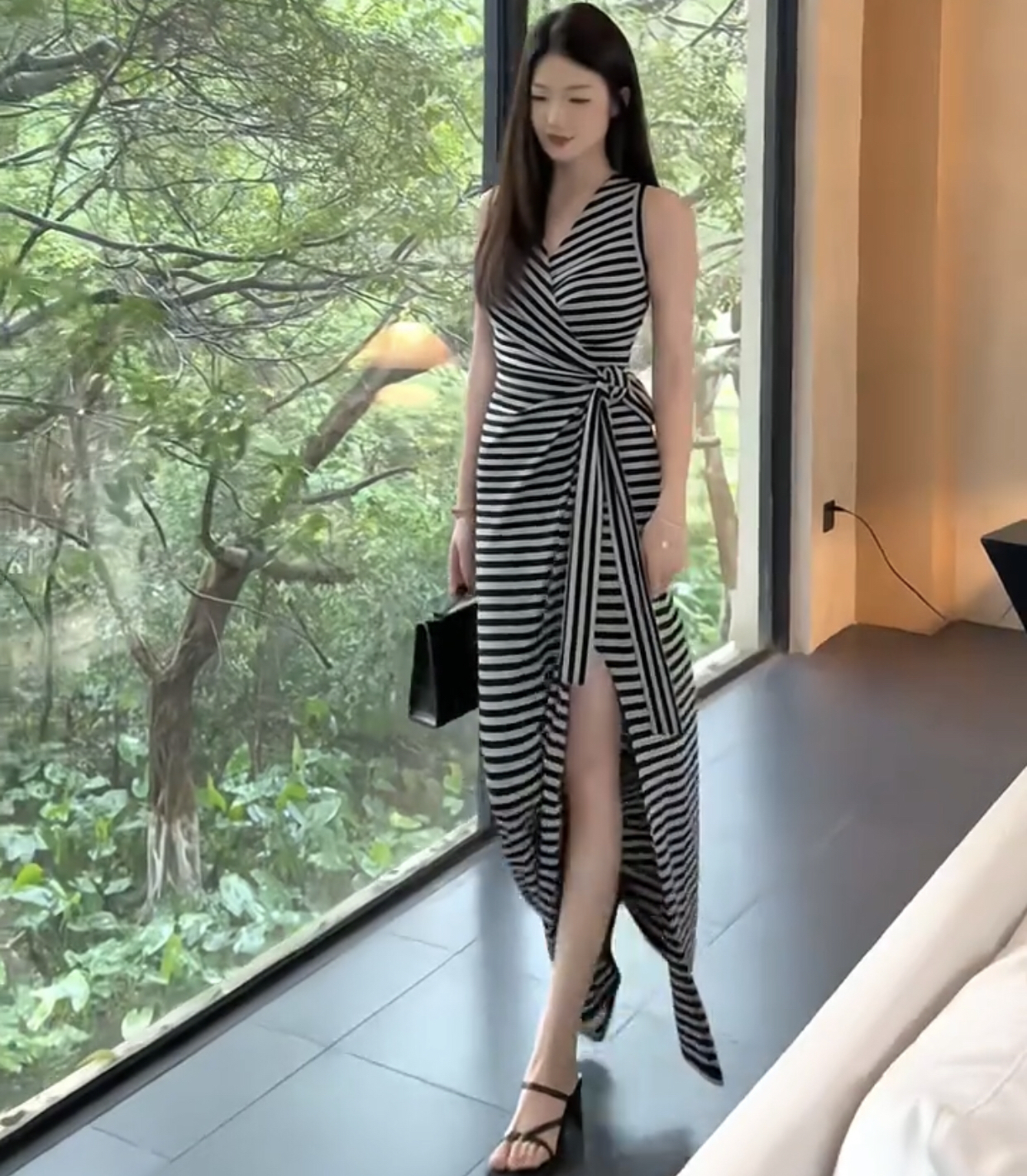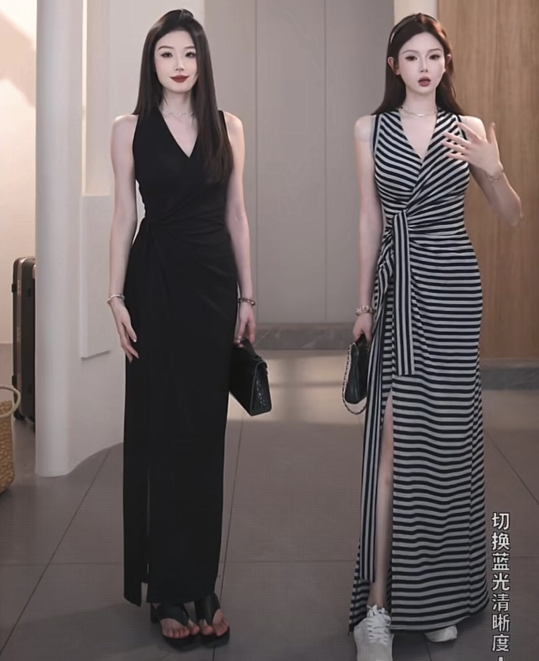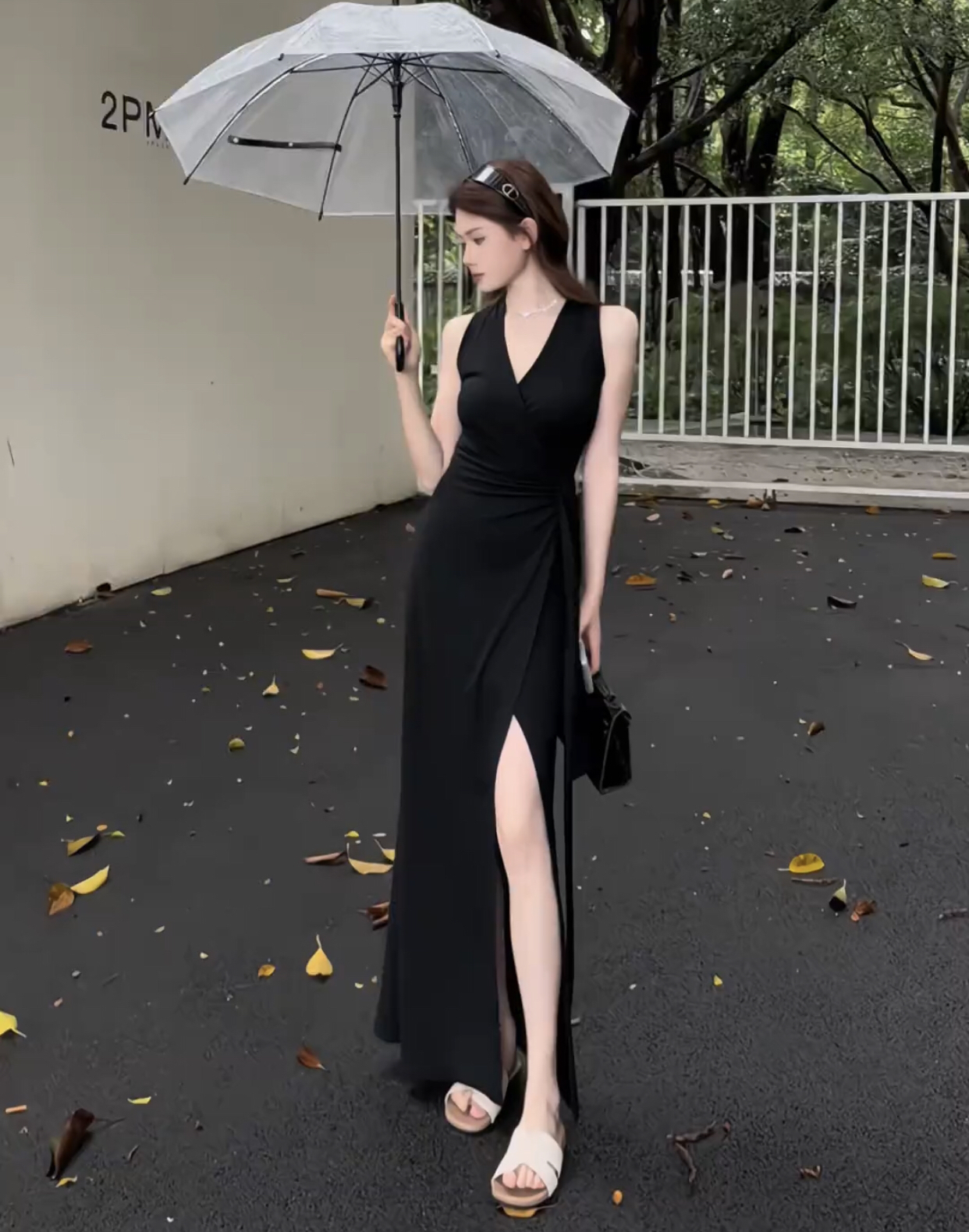 格纹无袖连衣裙女夏设计感小众V领拼接绑带开叉收腰显瘦直筒长裙