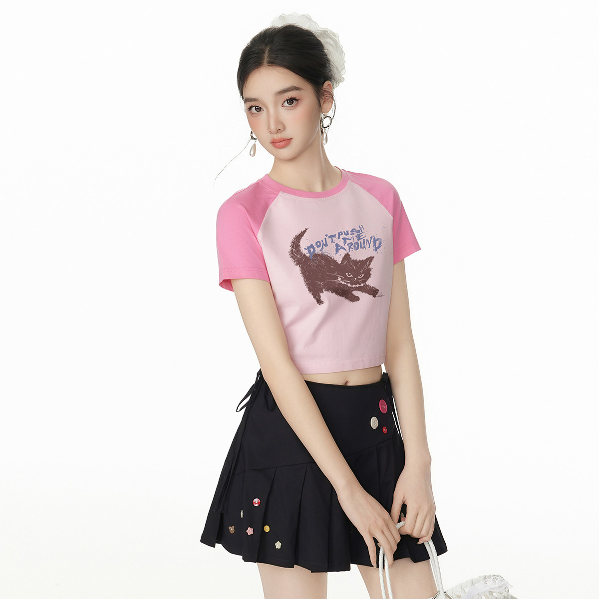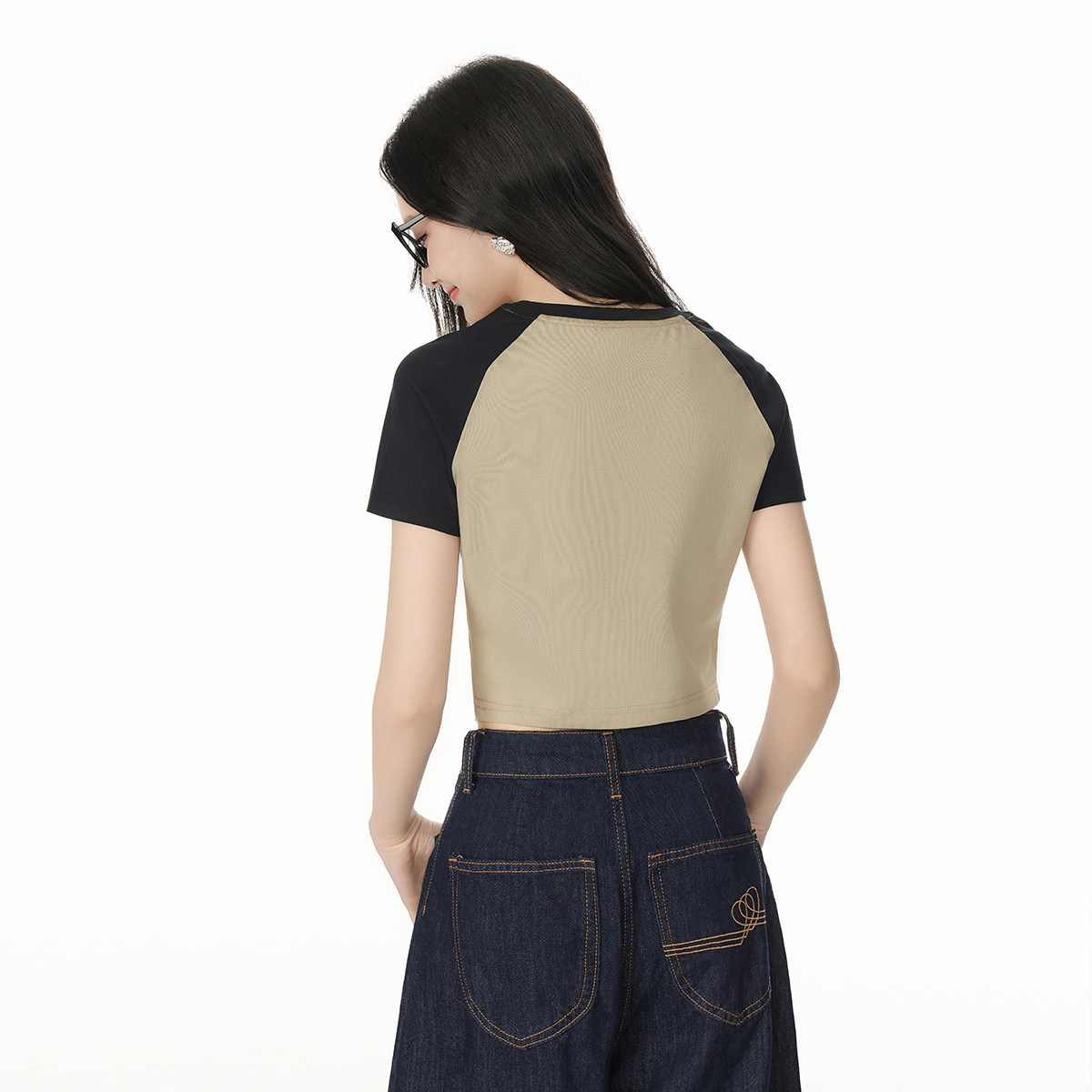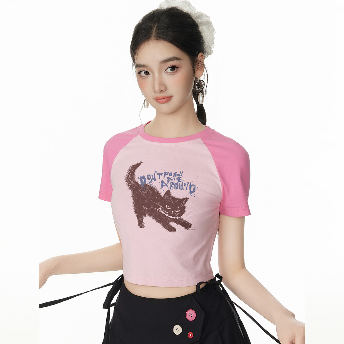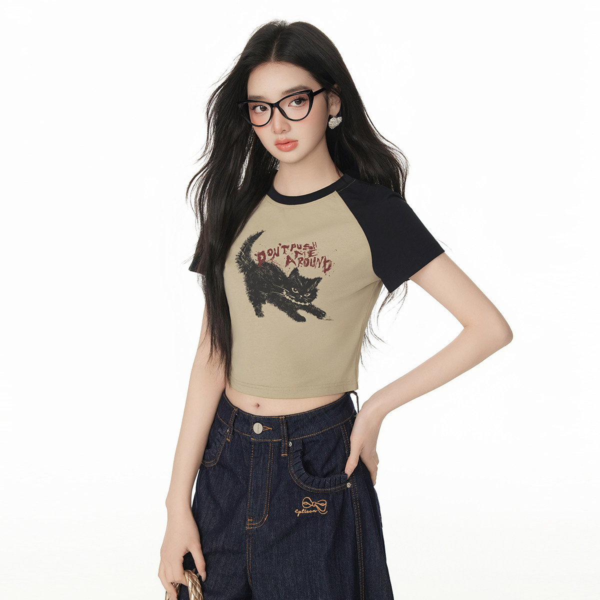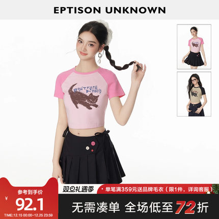 EPTISON短袖T恤女2025夏季新款复古印花短款修身插肩袖甜辣小上衣