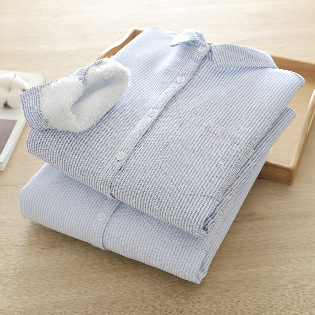 文艺小清新通勤OL风竖条纹加绒加厚纯棉正肩白衬衫女长袖打底衫潮