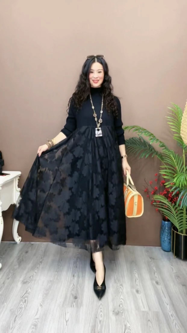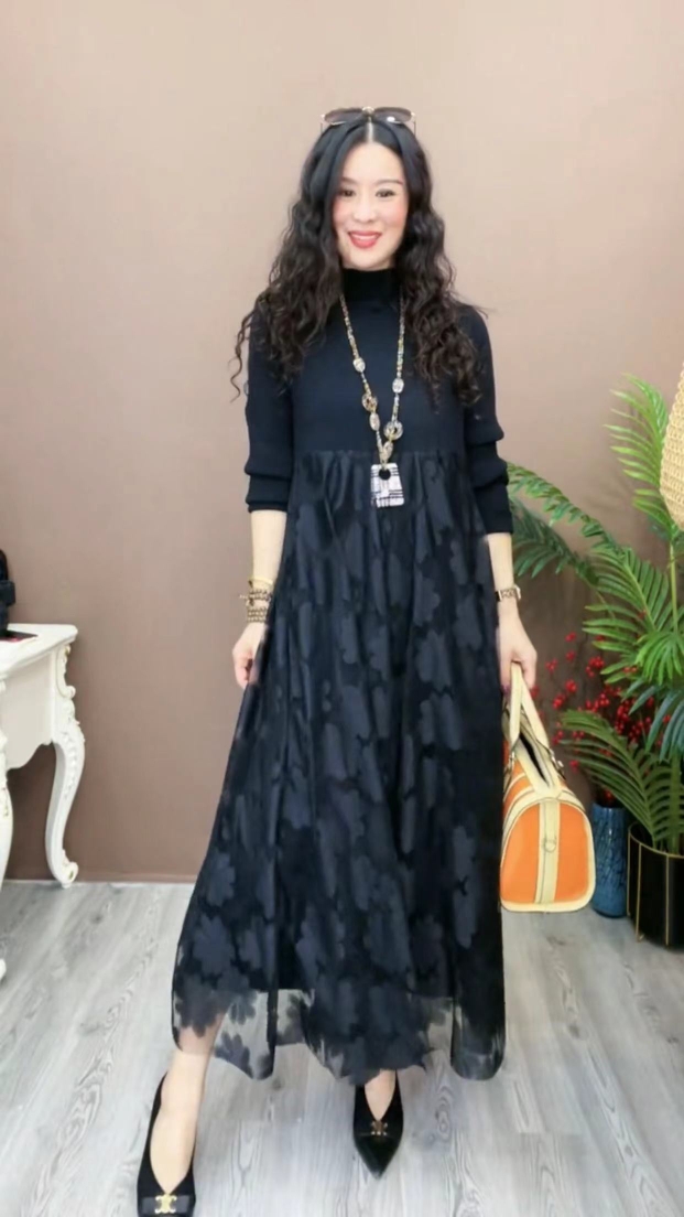 针织羊毛连衣裙女秋冬新款显瘦刺绣蕾丝拼接保暖打底单穿百搭长裙