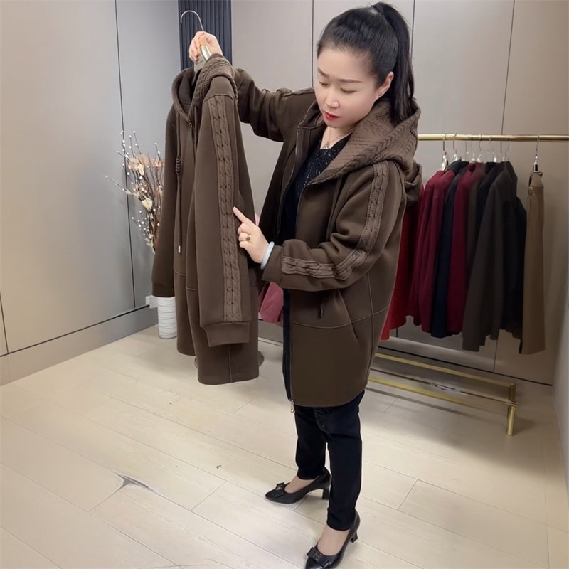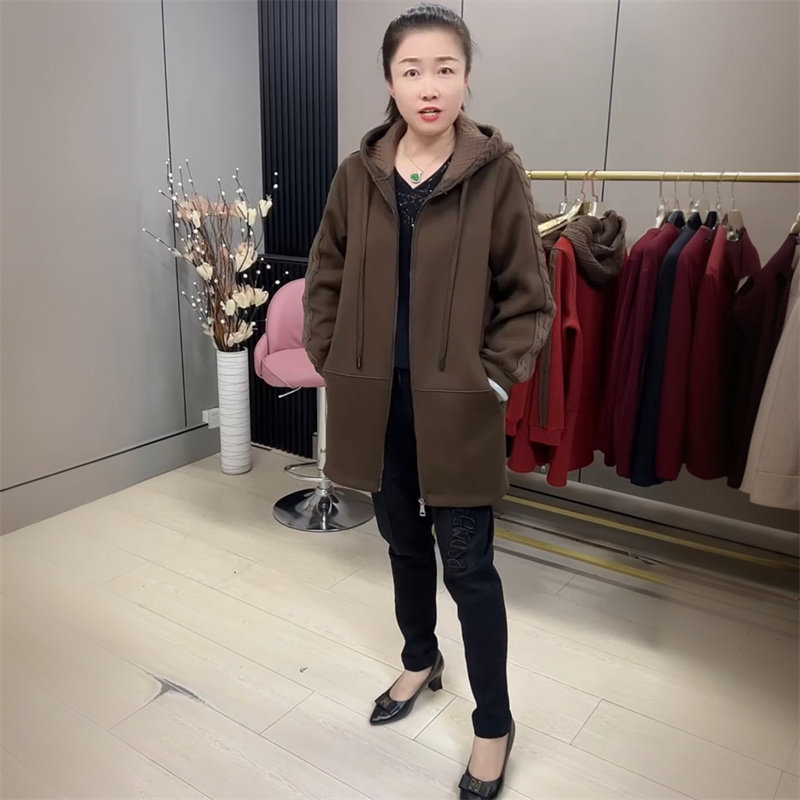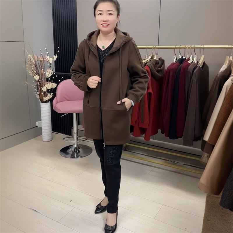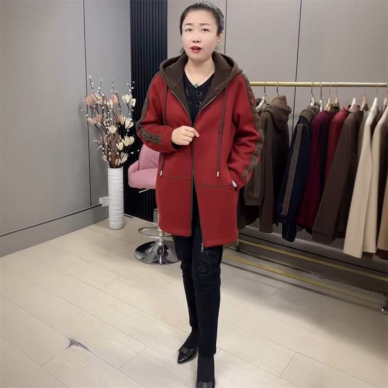 中年妈妈连帽休闲毛呢大衣女中长款秋冬季加厚宽松显瘦大码外套