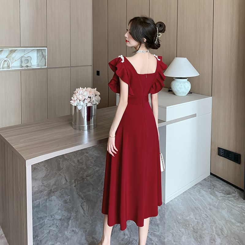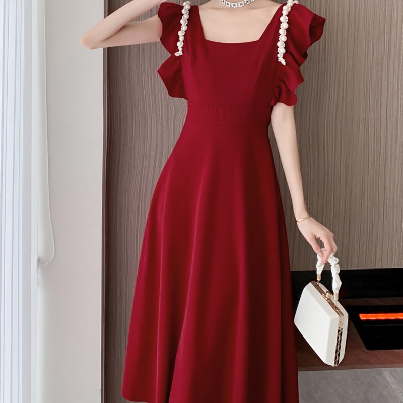 法式方领高档钉珠红色敬酒服新娘平时可穿连衣裙高贵简约礼服裙女