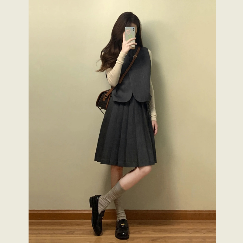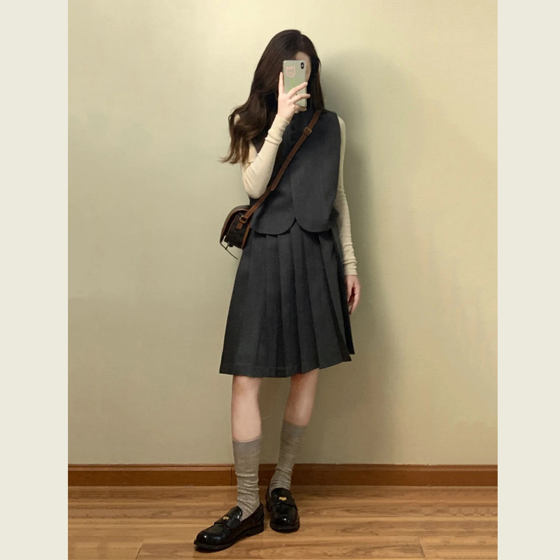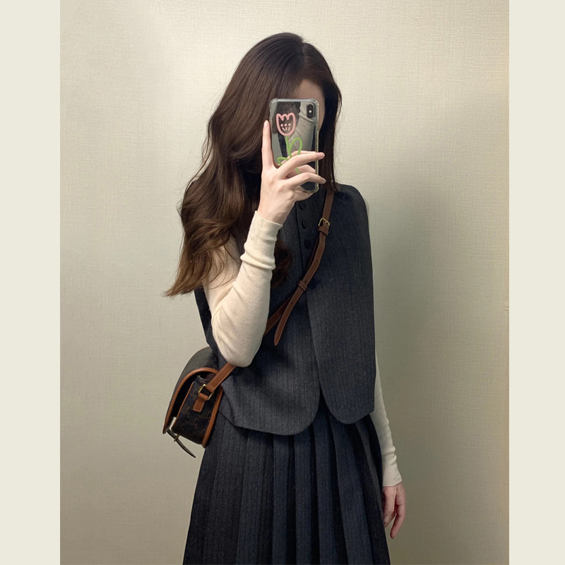 韩版气质通勤时尚套装女春秋季新款灰色西装马甲高腰半身裙两件套