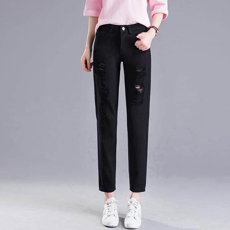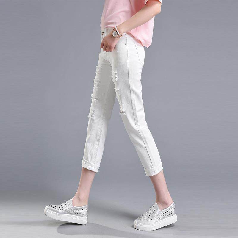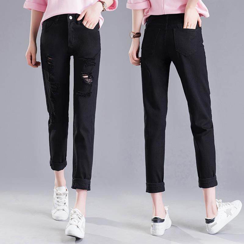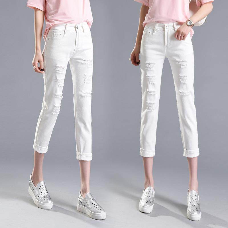 2023夏季薄款bf风韩版白色破洞牛仔裤女高腰宽松显瘦九分裤哈伦裤