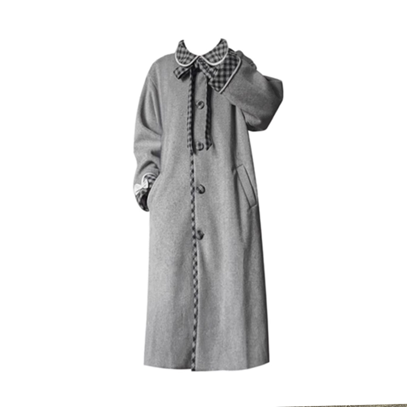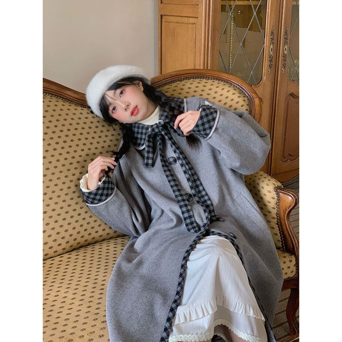 灰色秋冬宽松中长款甜美可爱毛呢外套秋冬新款系带格子加厚大衣女