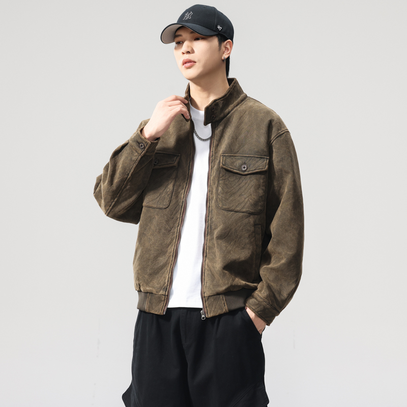 秋季高级感斑马纹洗褪蜡感皮工装宽松秋新款美式复古立领夹克外套