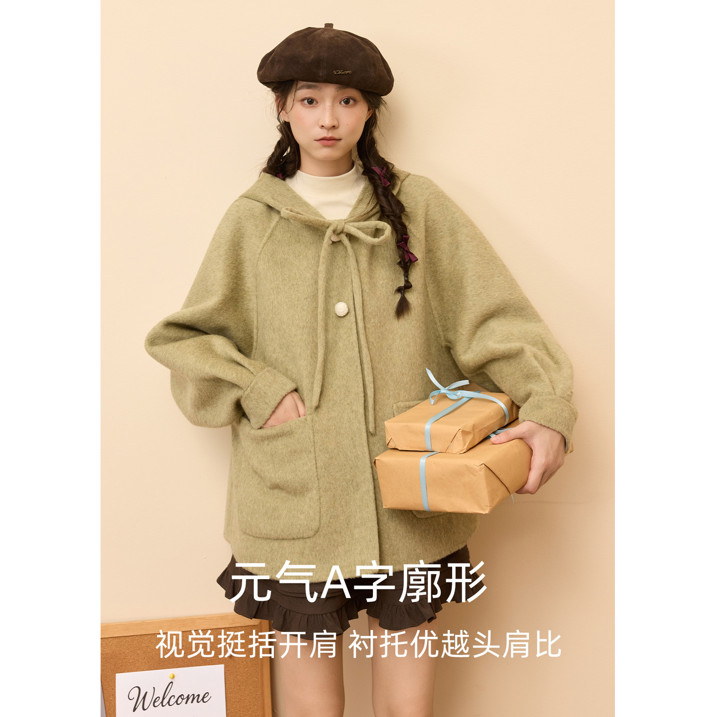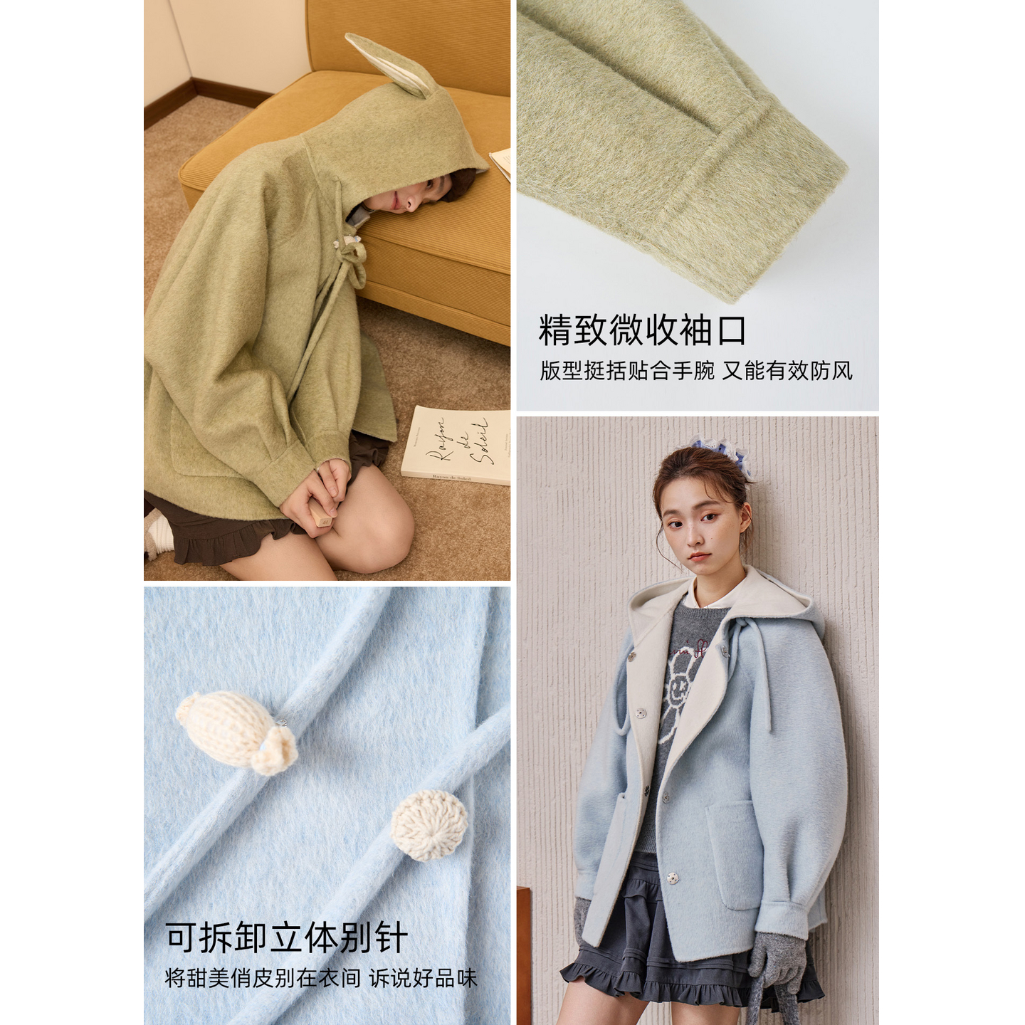 【美利奴羊毛】紫涵双面呢大衣女2025年冬季新款兔耳连帽毛呢外套