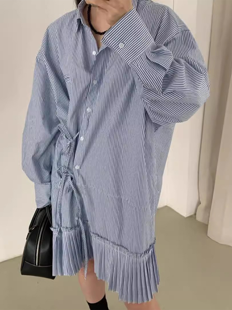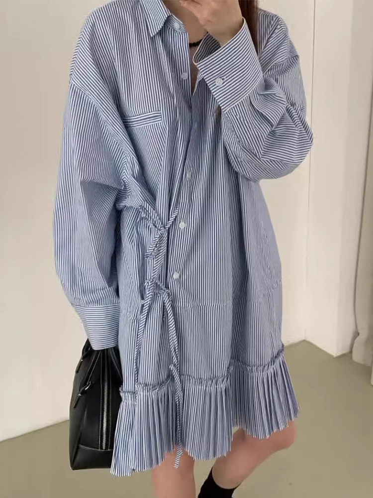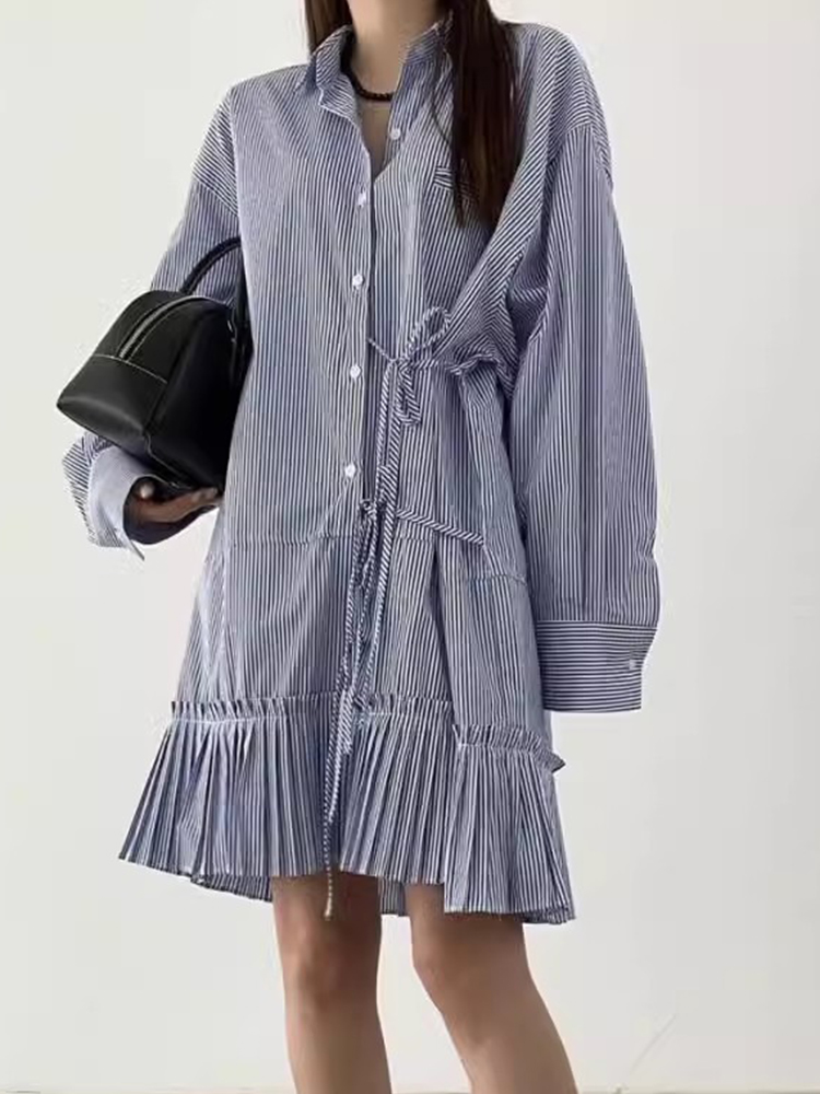 韩国chic秋季复古小众翻领侧边系带宽松拼接风琴褶长袖条纹连衣裙