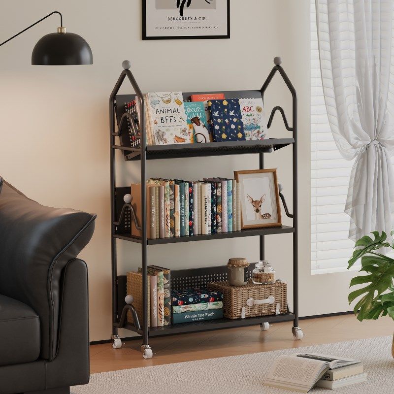 可移动书架落地置物架简易书桌旁收纳架铁艺儿童S绘本书柜一体靠
