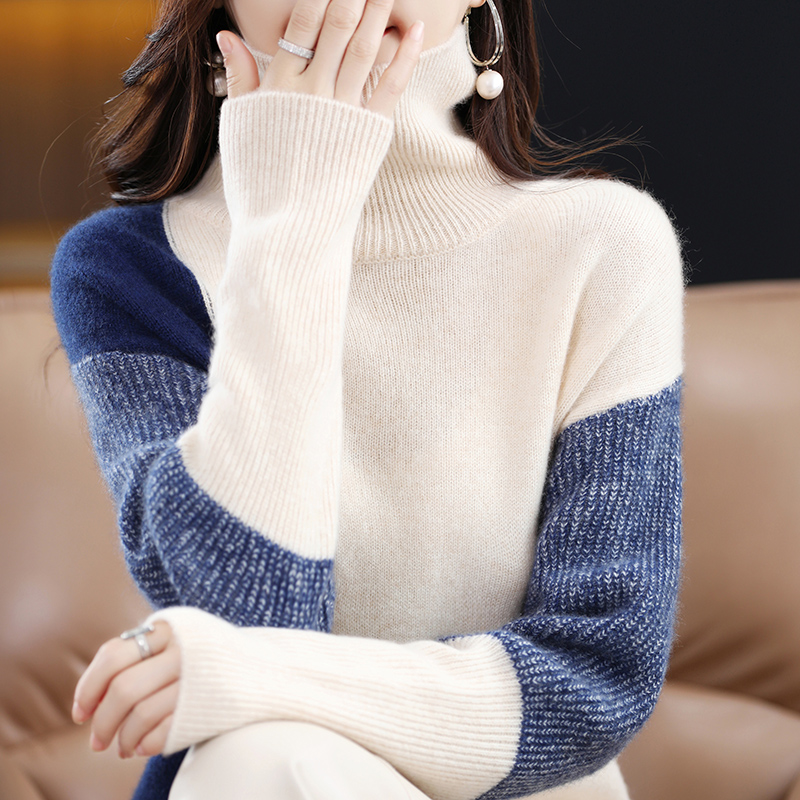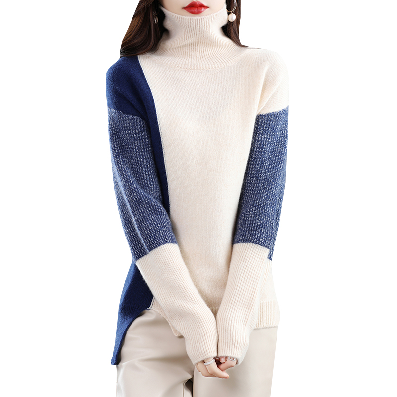 高领加厚100%羊毛衫女25秋冬新款不规则拼色毛衣宽松慵懒风羊绒衫