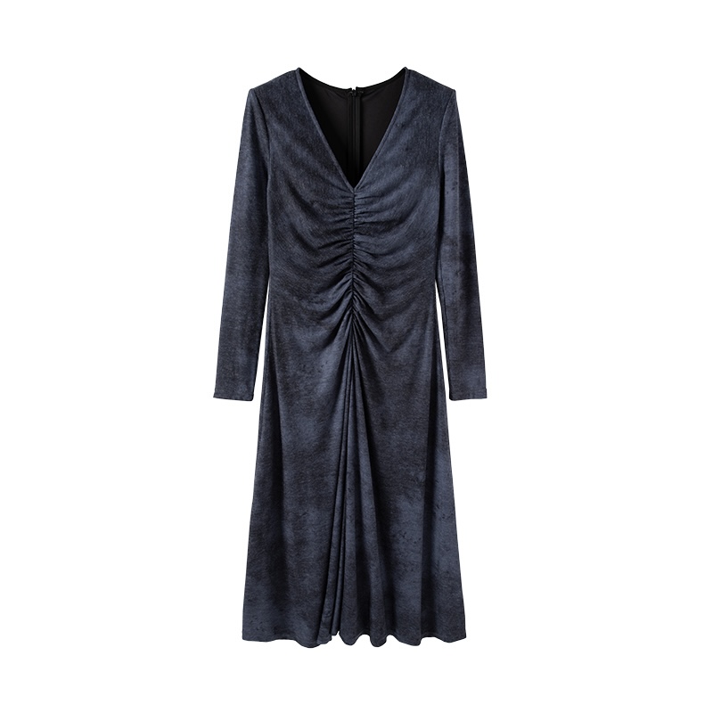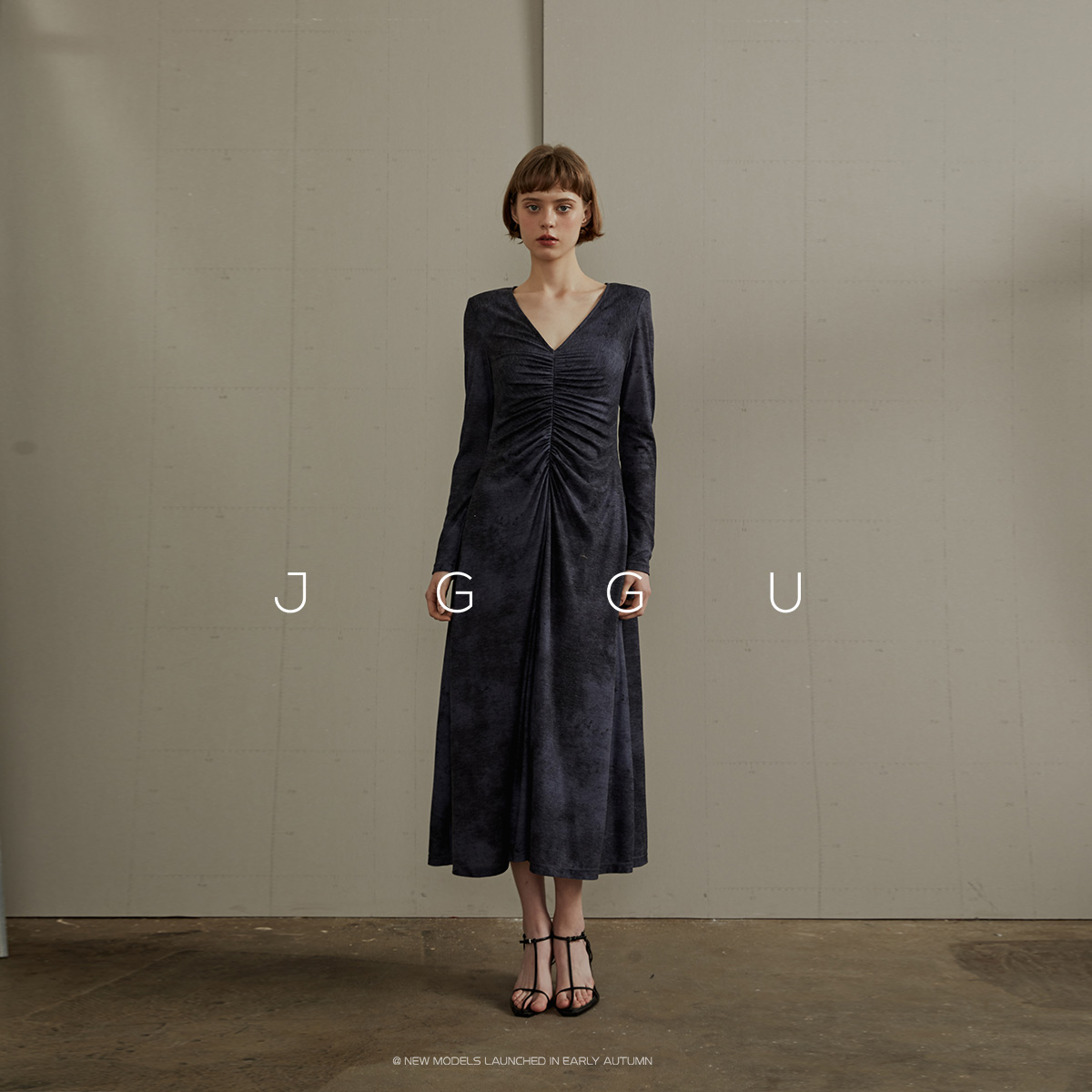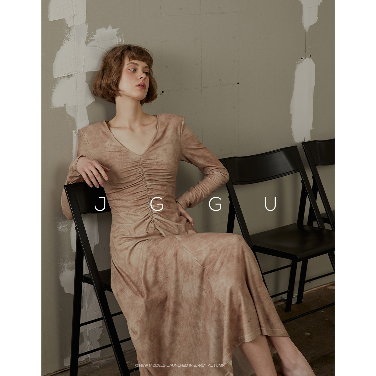 晶咕黑标JGGU高级晕染感纹理针织螺纹面料抽皱工艺修身显瘦连衣裙