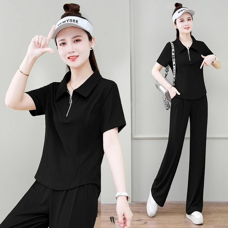 冰丝休闲运动服套装女2025夏季新款时尚洋气翻领短袖阔腿裤两件套