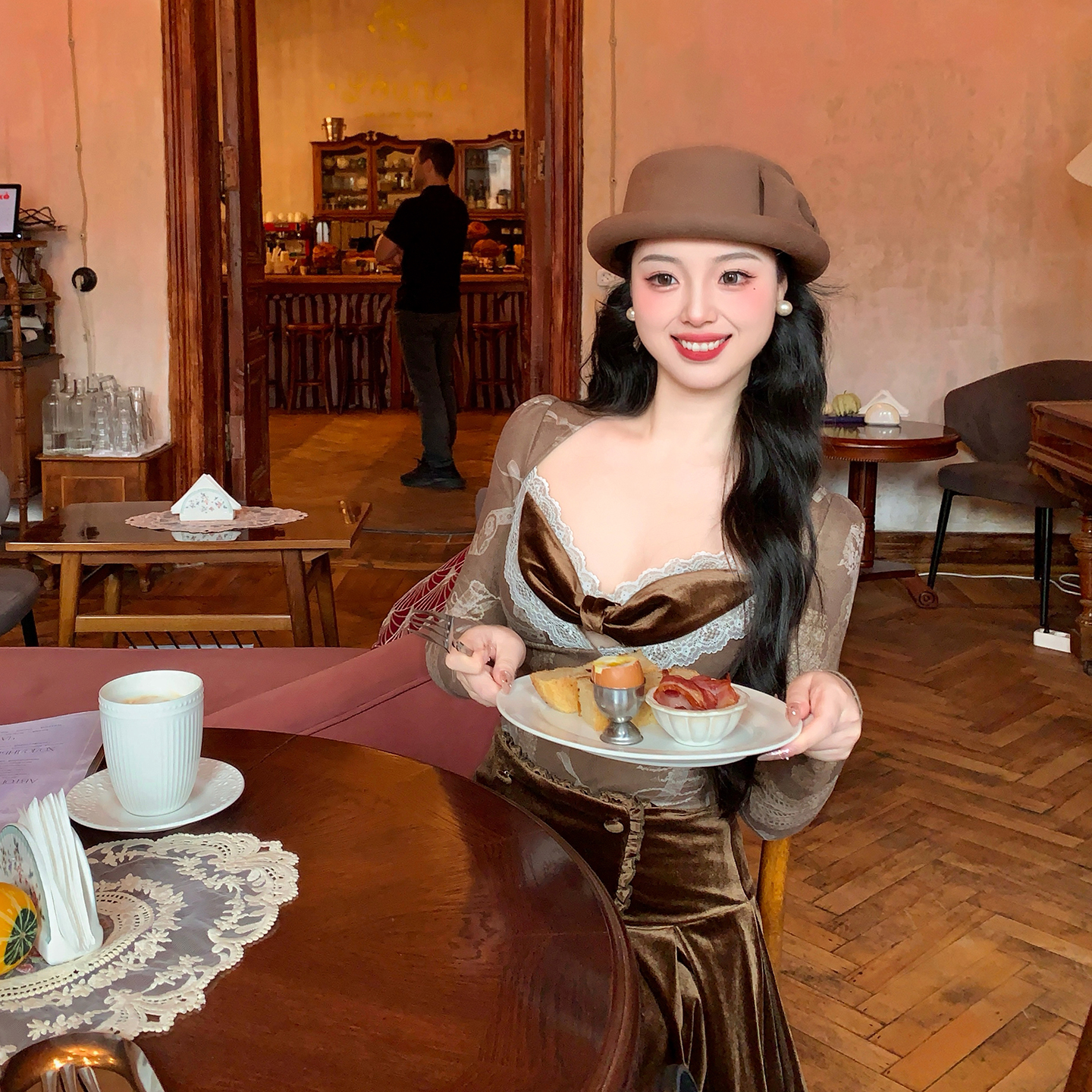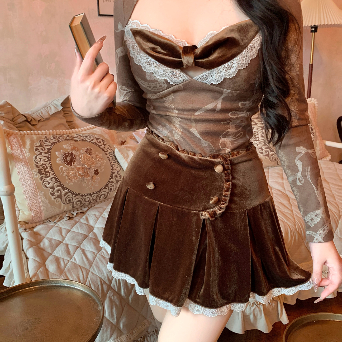 麓津自制《黑巧蕾丝派对》甜美少女上衣优雅复古棕色浪漫半身裙子