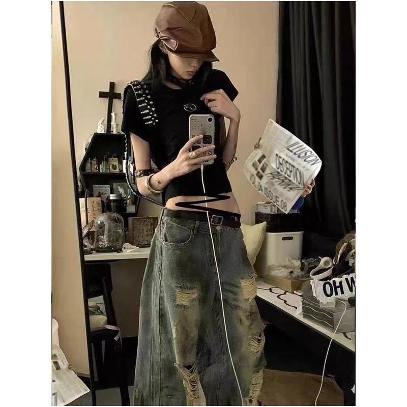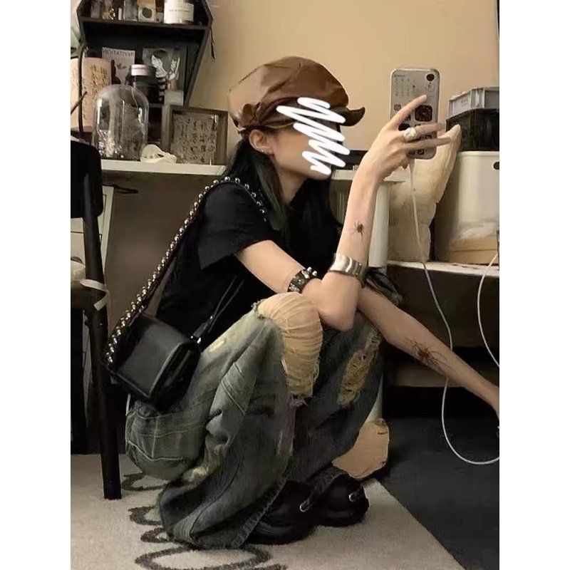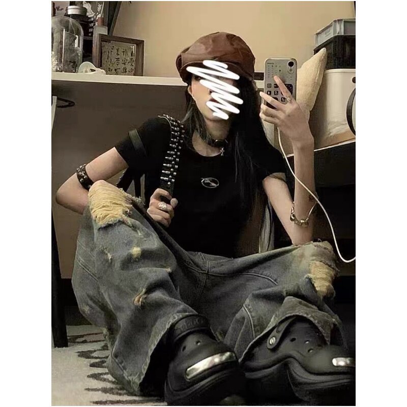美式高街破洞牛仔裤子女2025夏设计感复古宽松bf慵懒风阔腿长裤