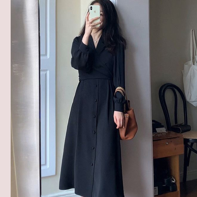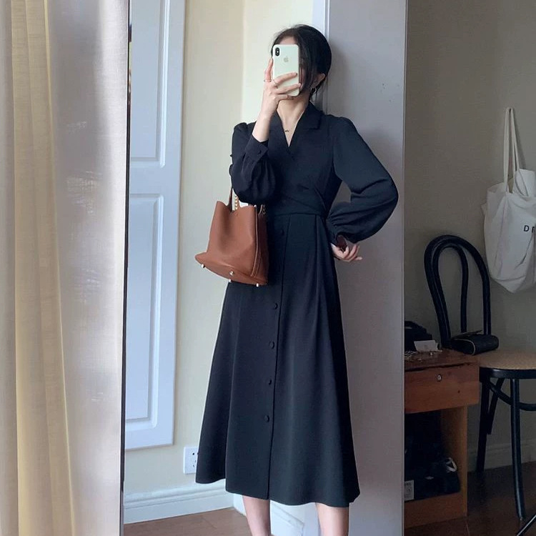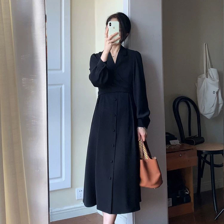 长袖西装褶皱系带连衣裙春秋胖mm法式裙收腰减龄遮肚显瘦大码女装