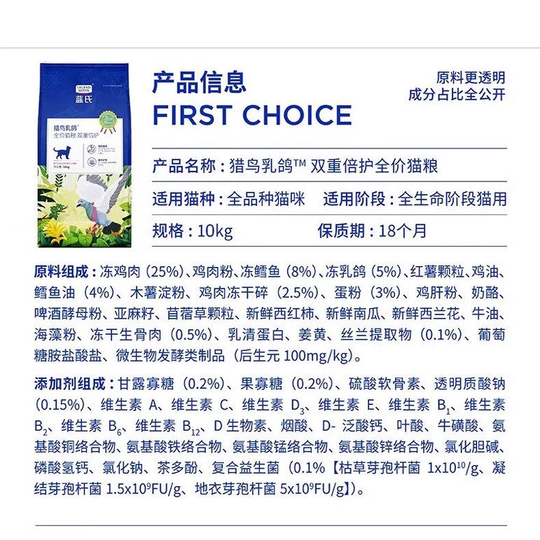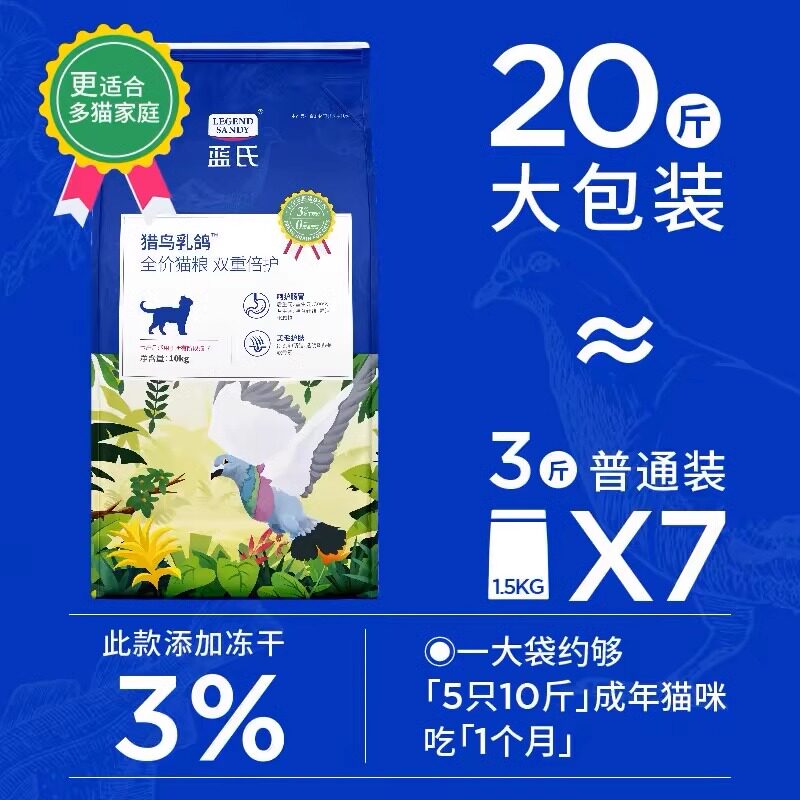 蓝氏乳鸽猫粮幼猫成猫试吃猎鸟乳鸽冻干全价10KG低敏无谷