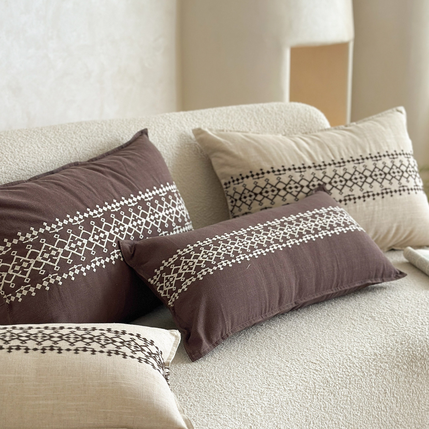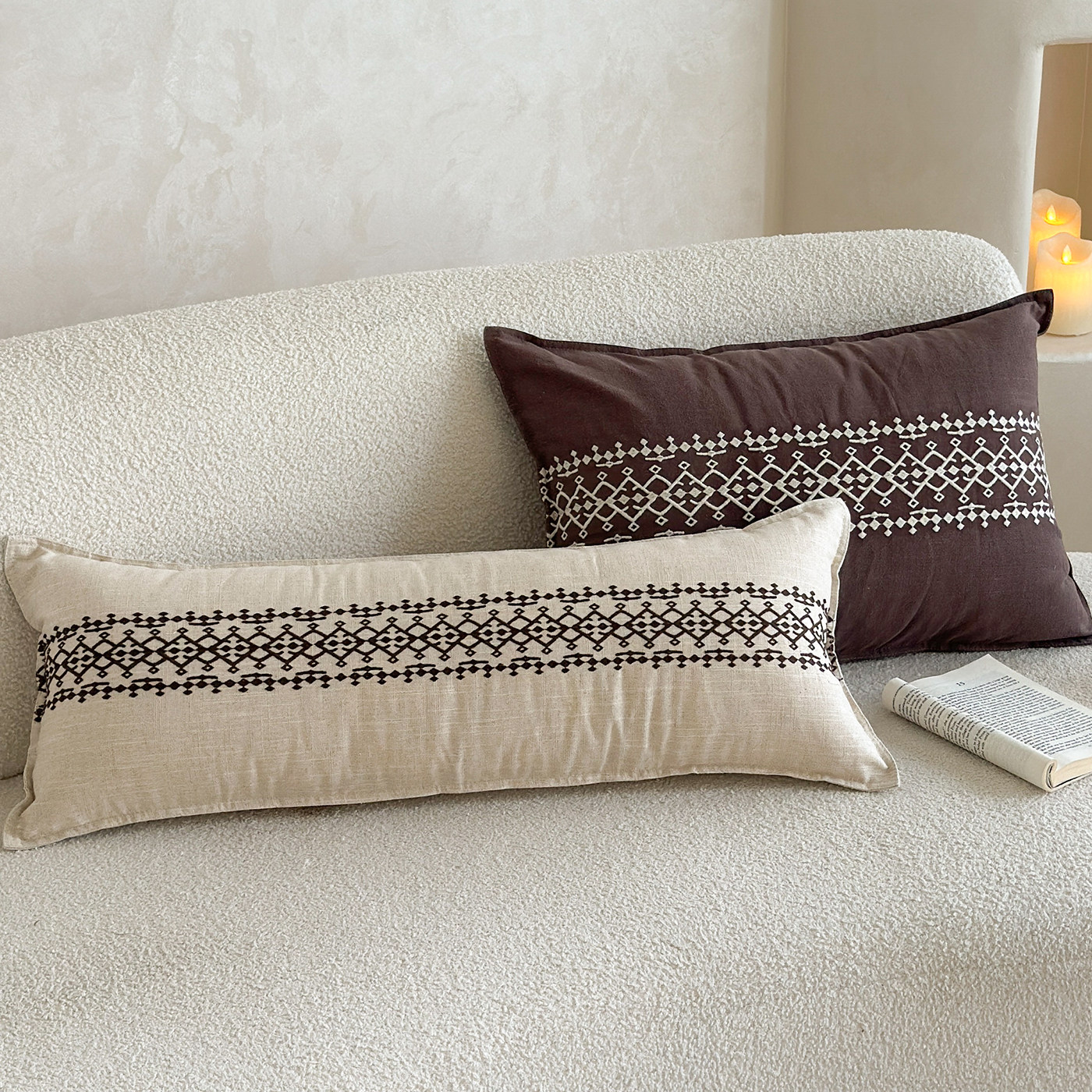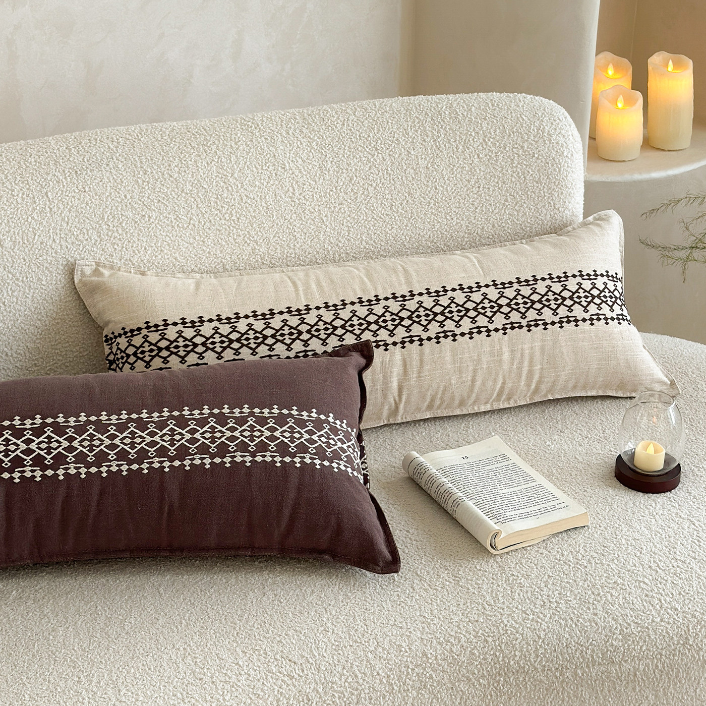 长条复古棉麻菱格花纹刺绣客厅靠背垫腰靠枕靠垫中式腰枕沙发抱枕