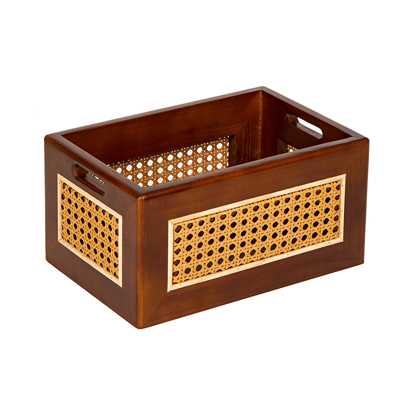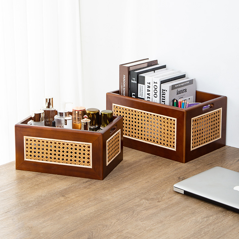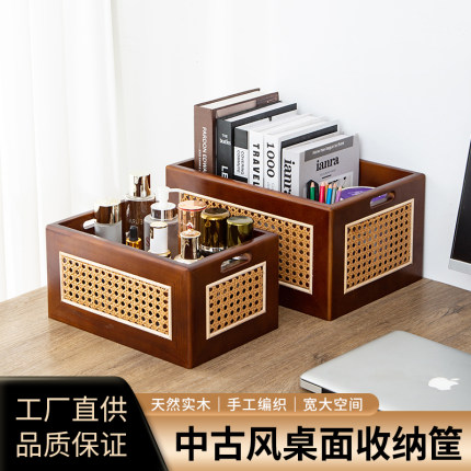 复古藤编收纳筐桌面实木收盒家用卧室零食盒玩具无盖木制收纳盒