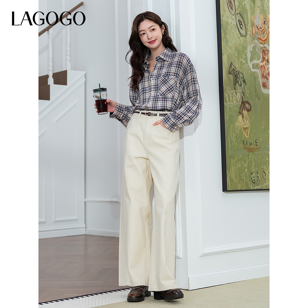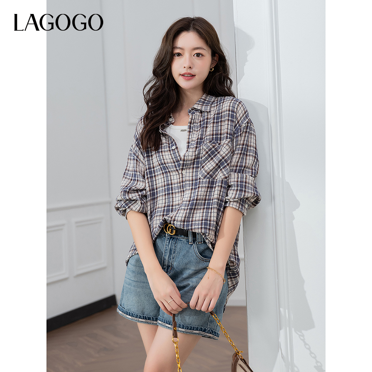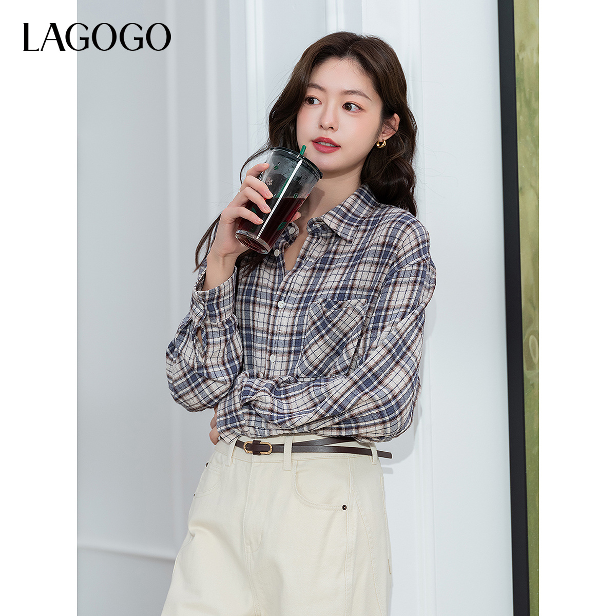 易打理LAGOGO格子通勤衬衫女拉谷谷2025秋冬新款宽松休闲薄外套