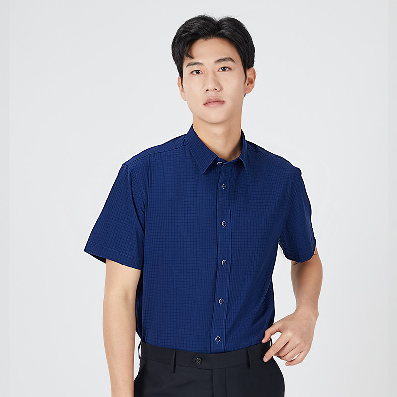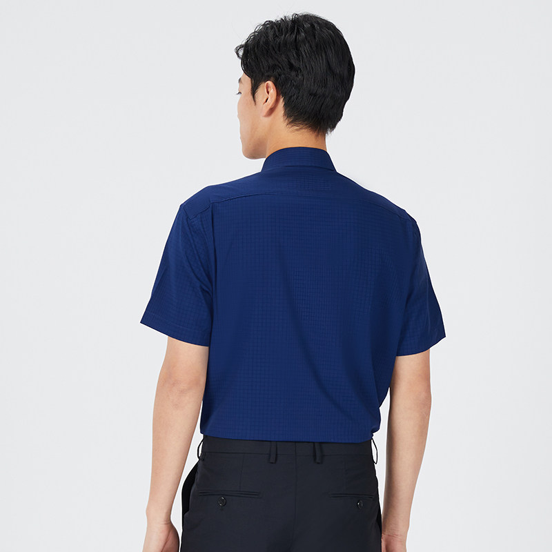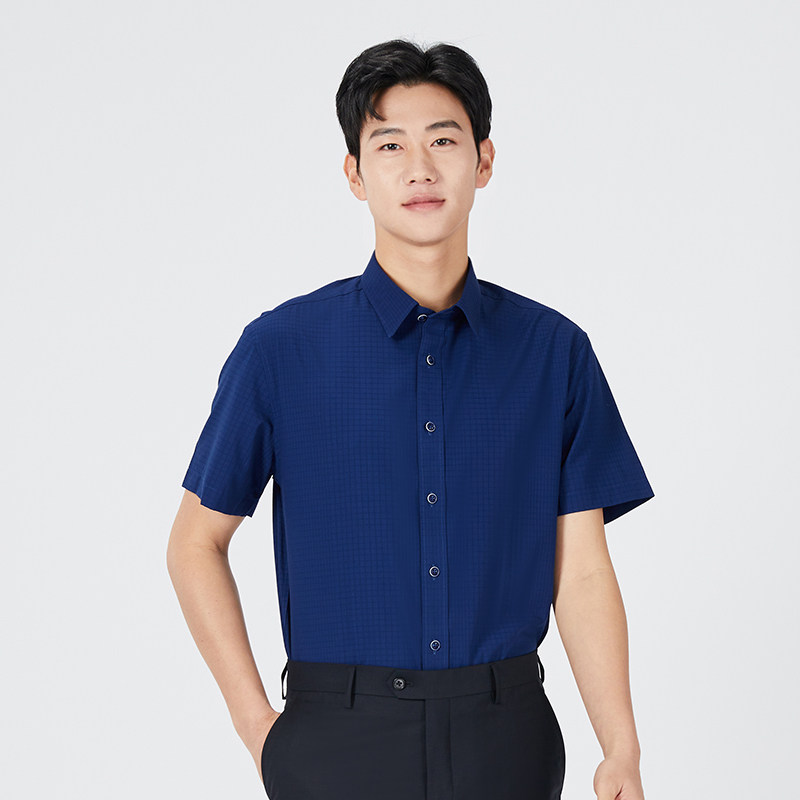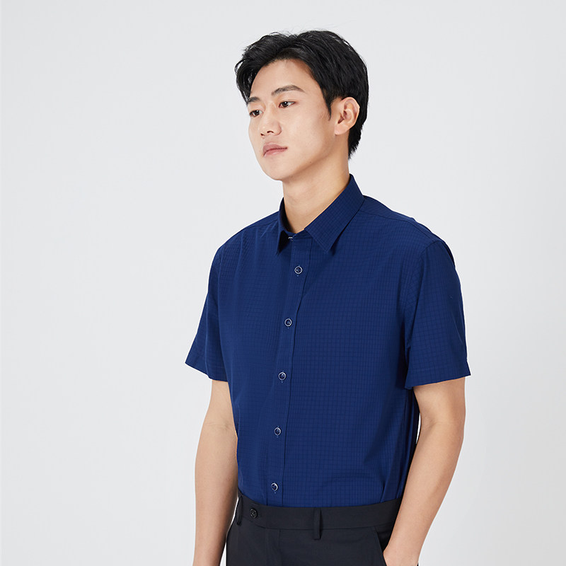 乔治白夏季薄款男士短袖衬衫尖领藏青暗格衬衣垂顺微弹休闲修身上