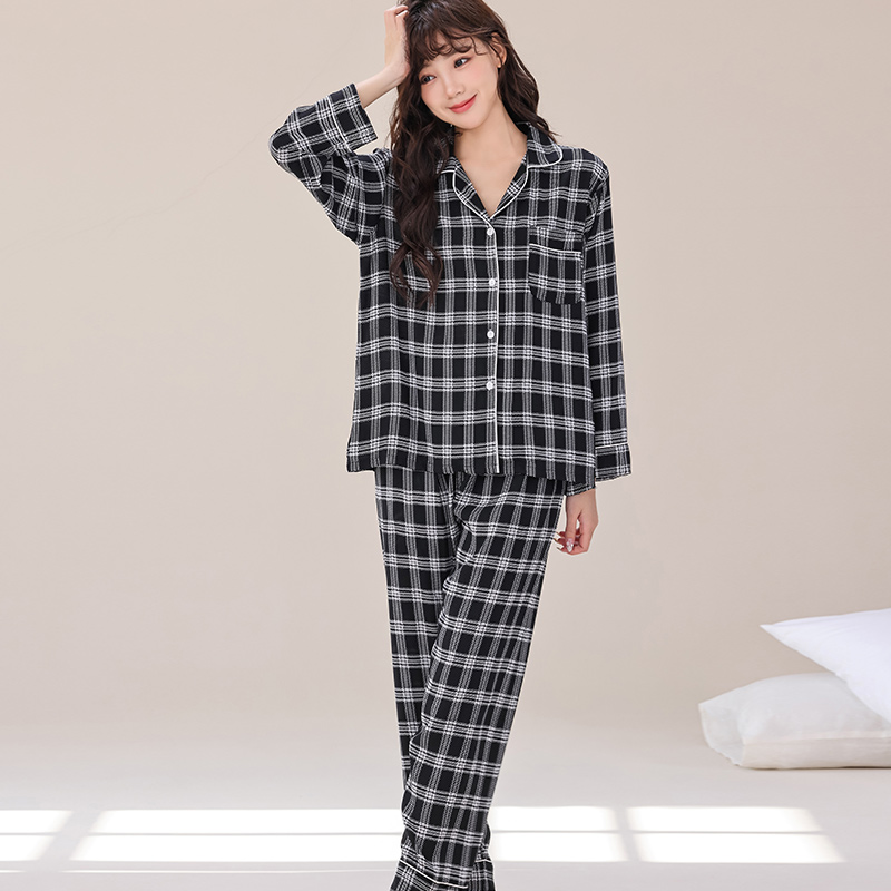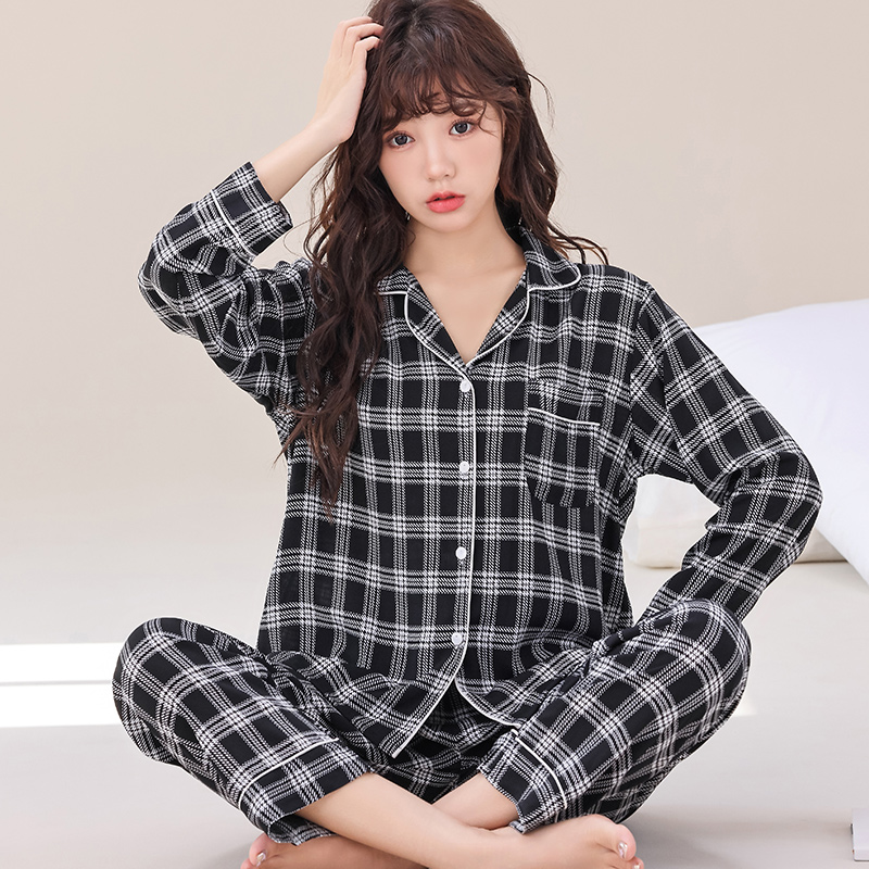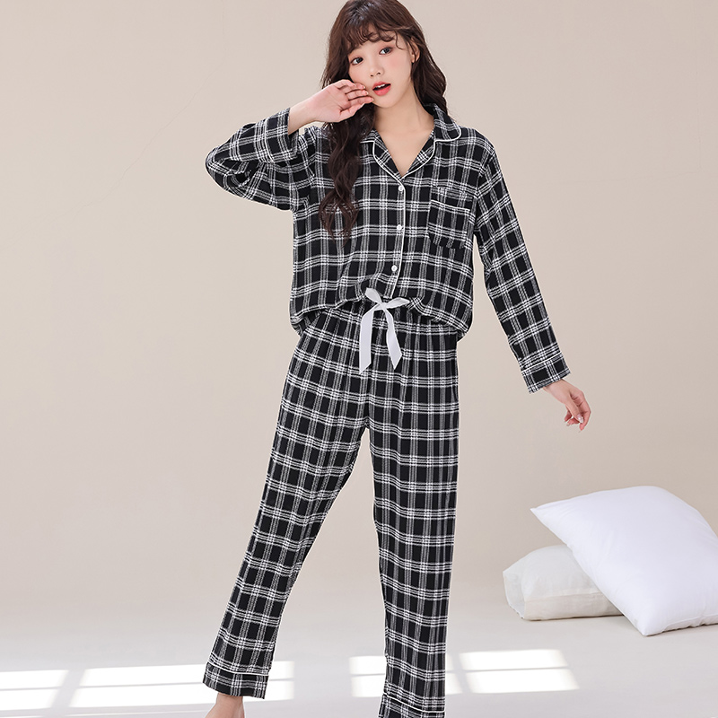 长袖棉绸睡衣女春秋夏季月子服家居服日系格子开衫绵绸套装薄大码