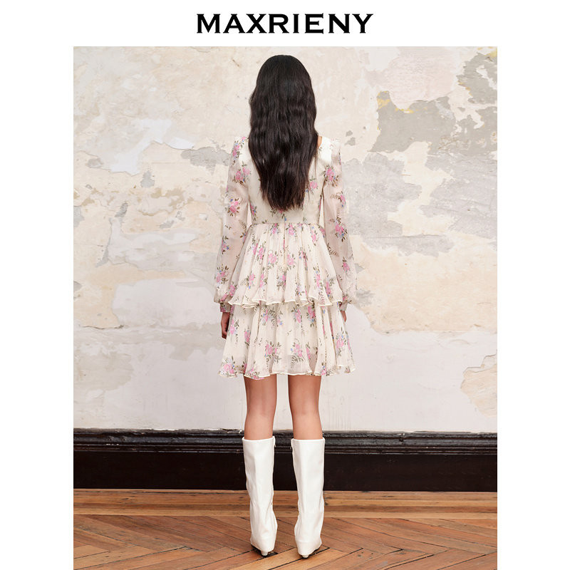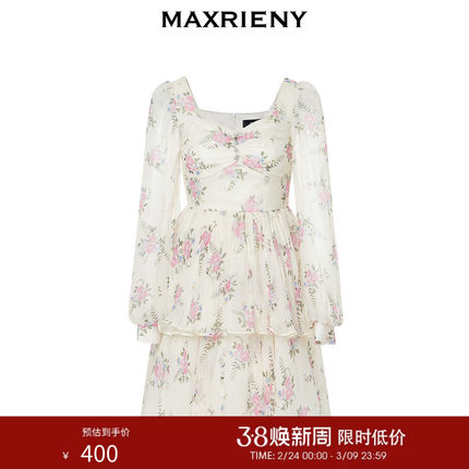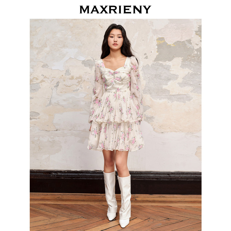 MAXRIENY复古真丝碎花连衣裙桑蚕丝裙子
