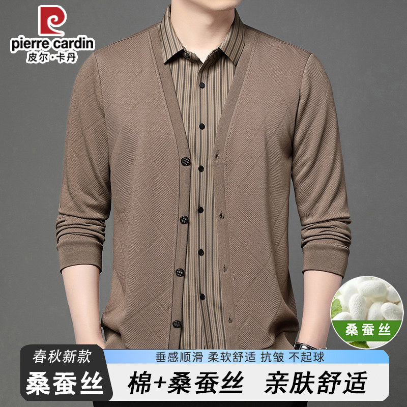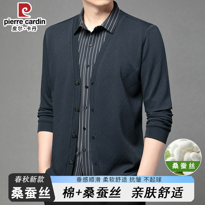 皮尔卡丹高档桑蚕丝针织开衫假两件男士长袖衬衫领无痕长袖打底衫