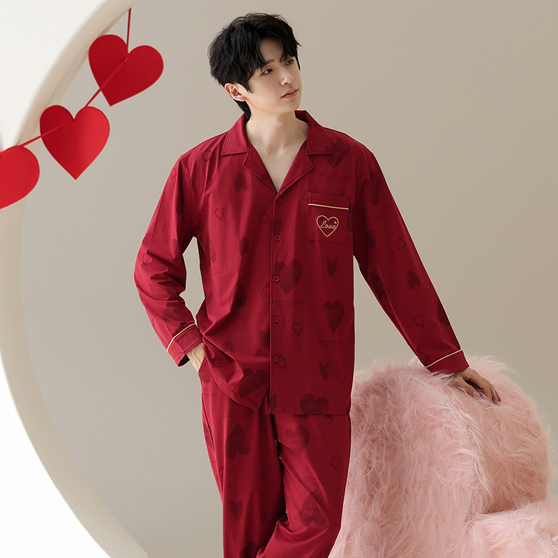 新一步纯棉开衫睡衣男士爱心印花长裤长袖翻领结婚家居服两件套装