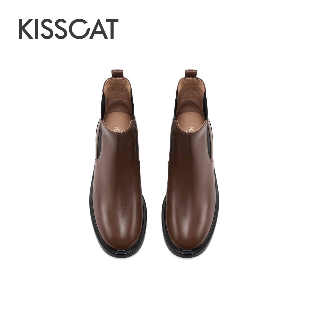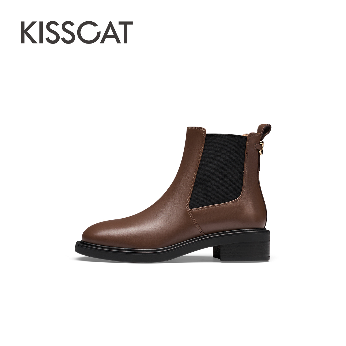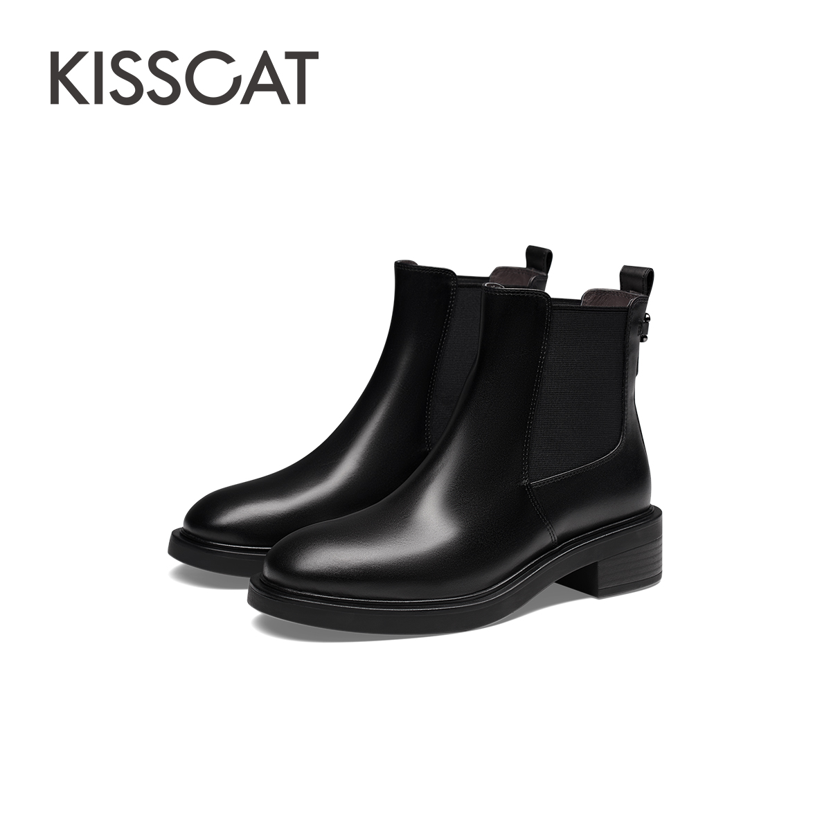 接吻猫秋季新款经典短筒靴质感时尚弹力靴真皮粗跟切尔西靴女