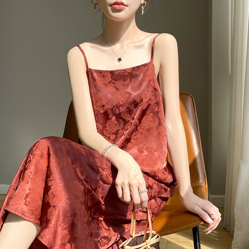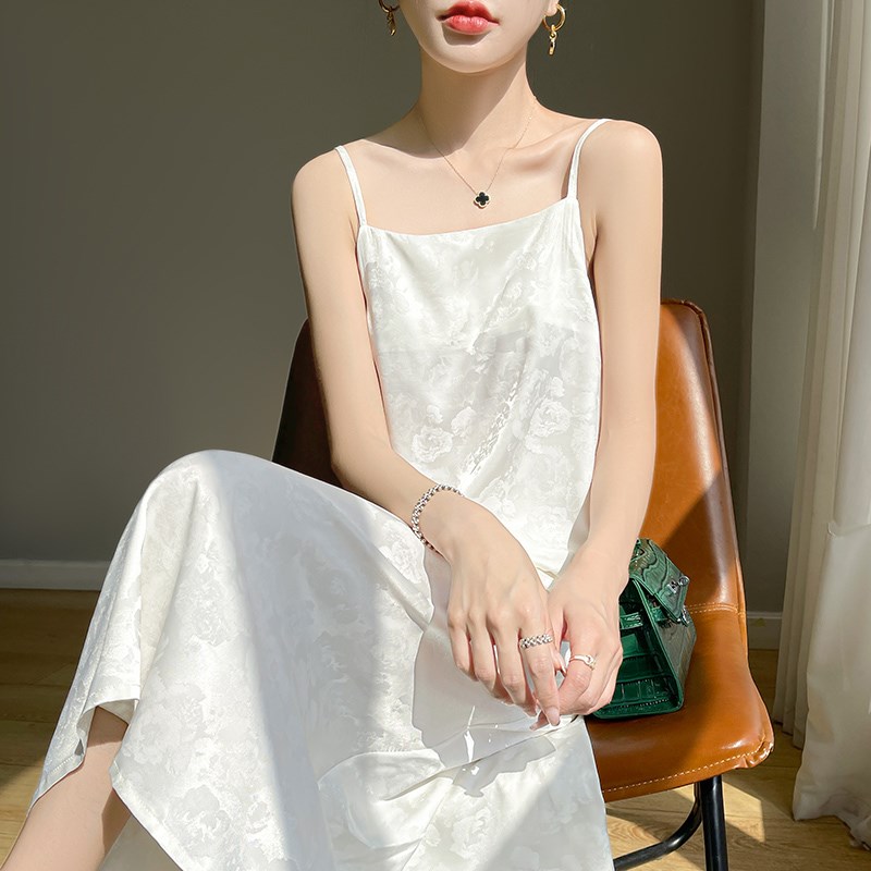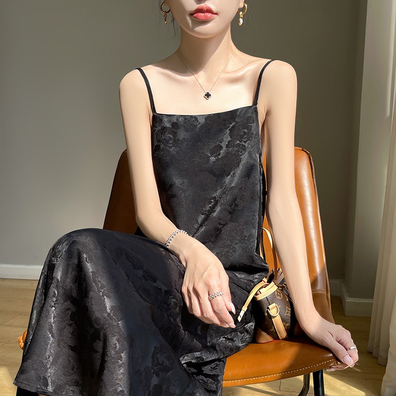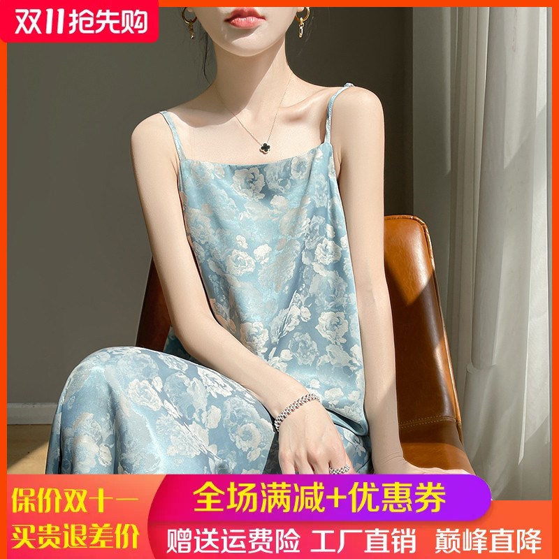 夏款缎面真丝一字领薄款连衣裙女宽松显瘦吊带提花长裙A字打底裙