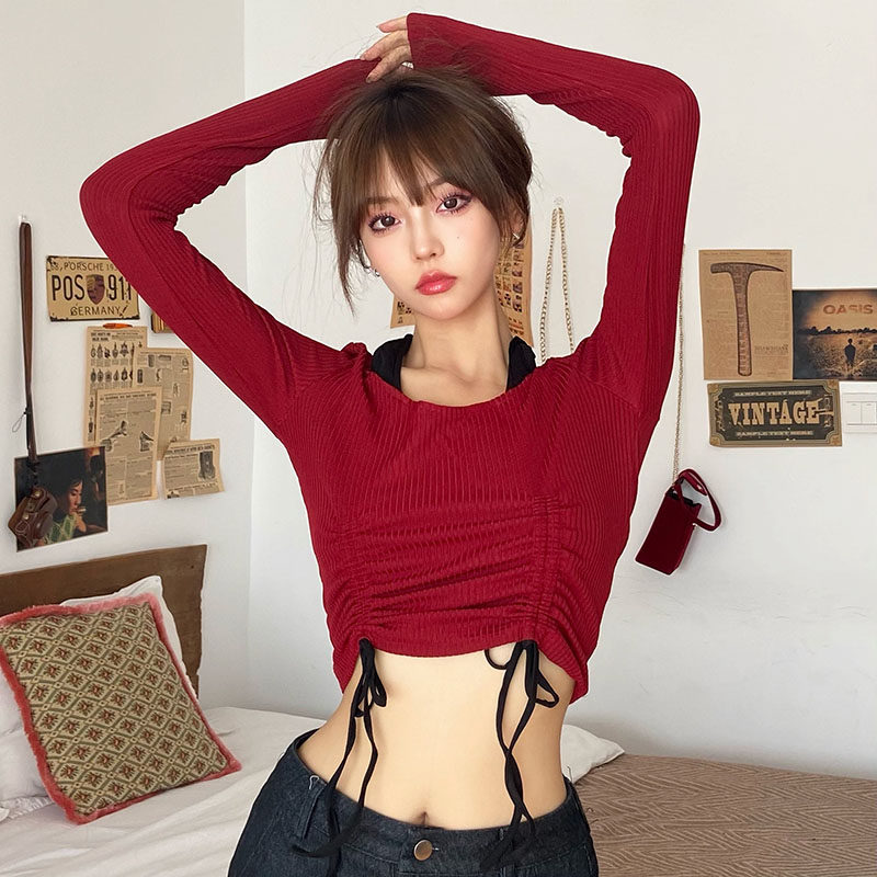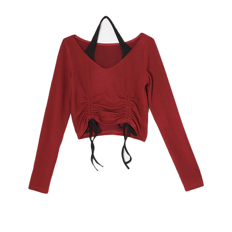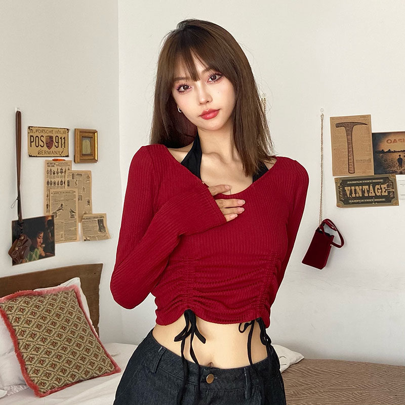 gagaopt 自制坑条拼接抽褶绑带挂脖t恤女ins大v领高腰个性短上衣