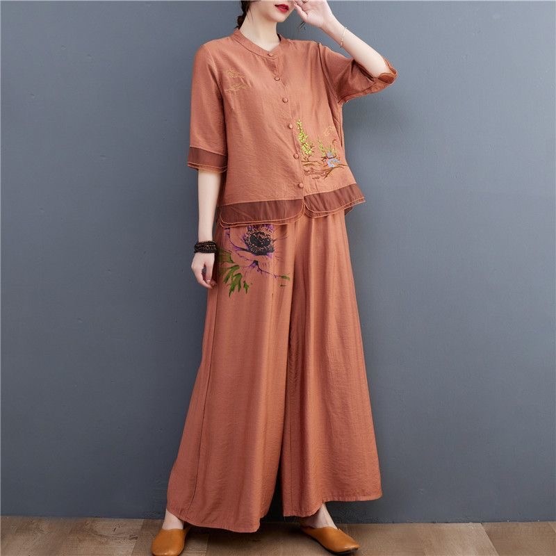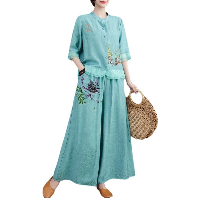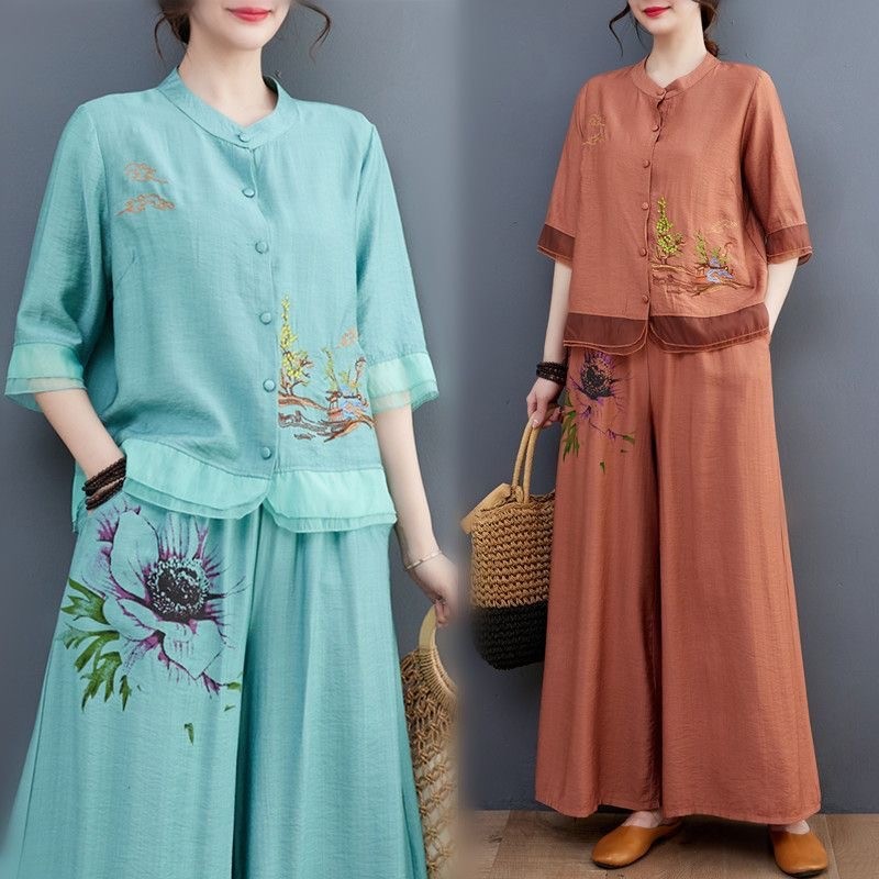 中老年女装夏装两件套绣花衬衫中袖上衣洋气妈妈装时尚阔腿裤套装