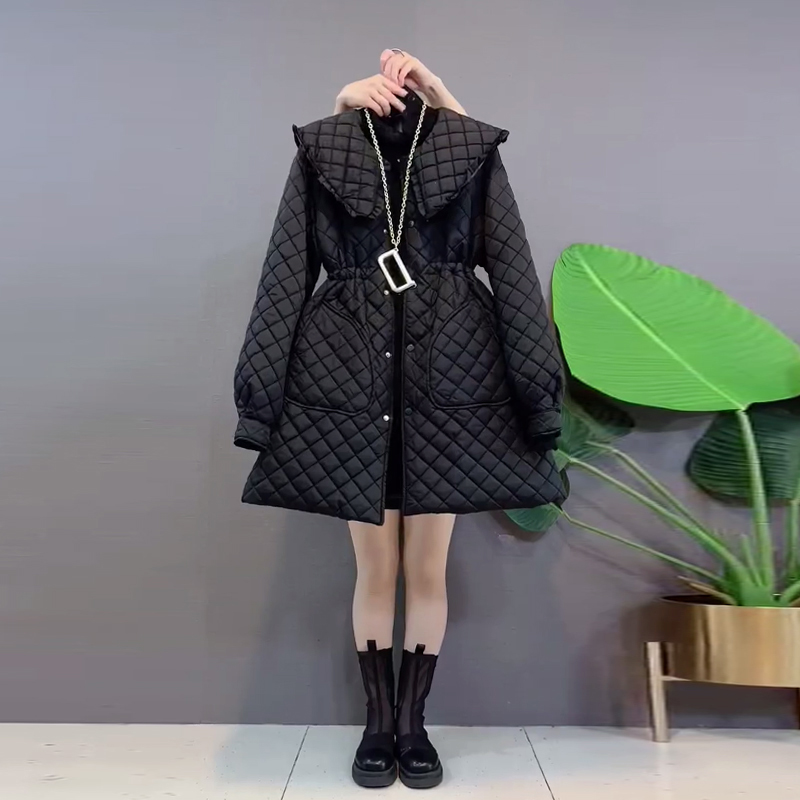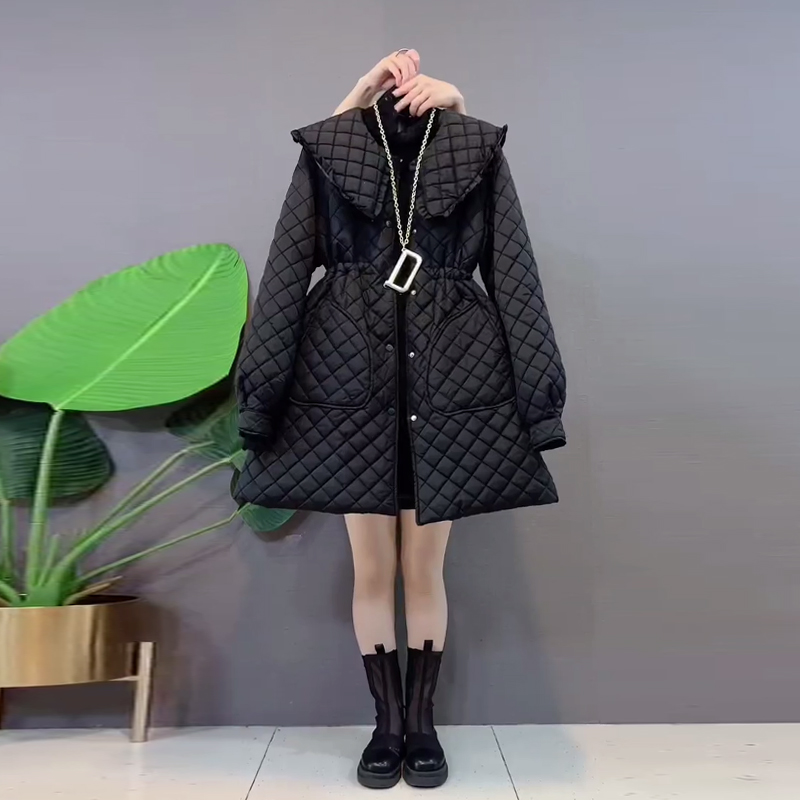 加肥娃娃领中长款收腰抽绳菱形格加棉外套大码女装冬季款轻薄棉服