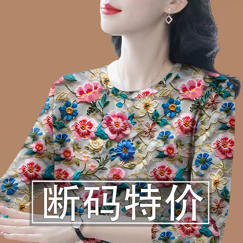 2025春秋上衣长袖t恤新款女宽松大码打底衫内搭复古印花圆领小衫