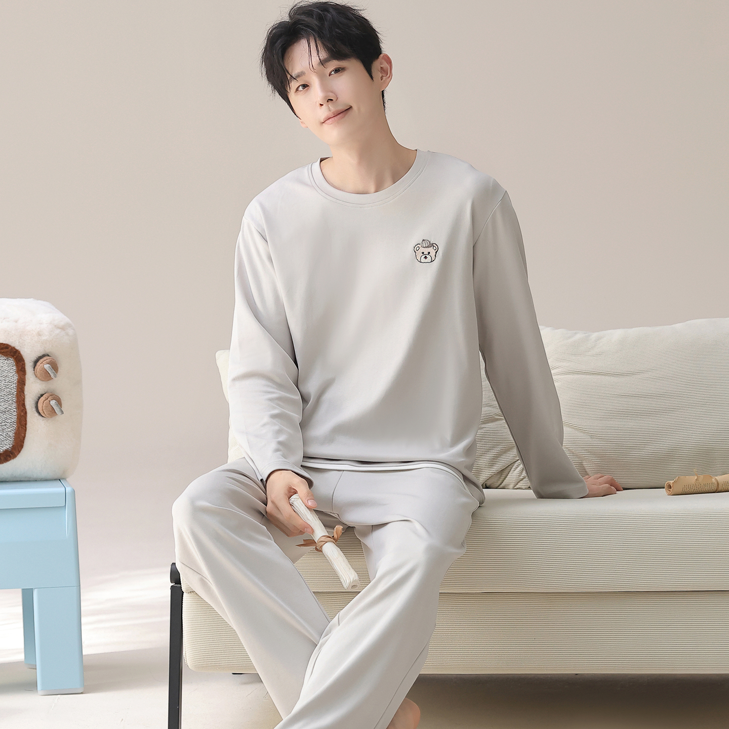 宜而爽休闲纯棉男士春秋款长袖长裤睡衣春秋季纯色圆领家居服套装