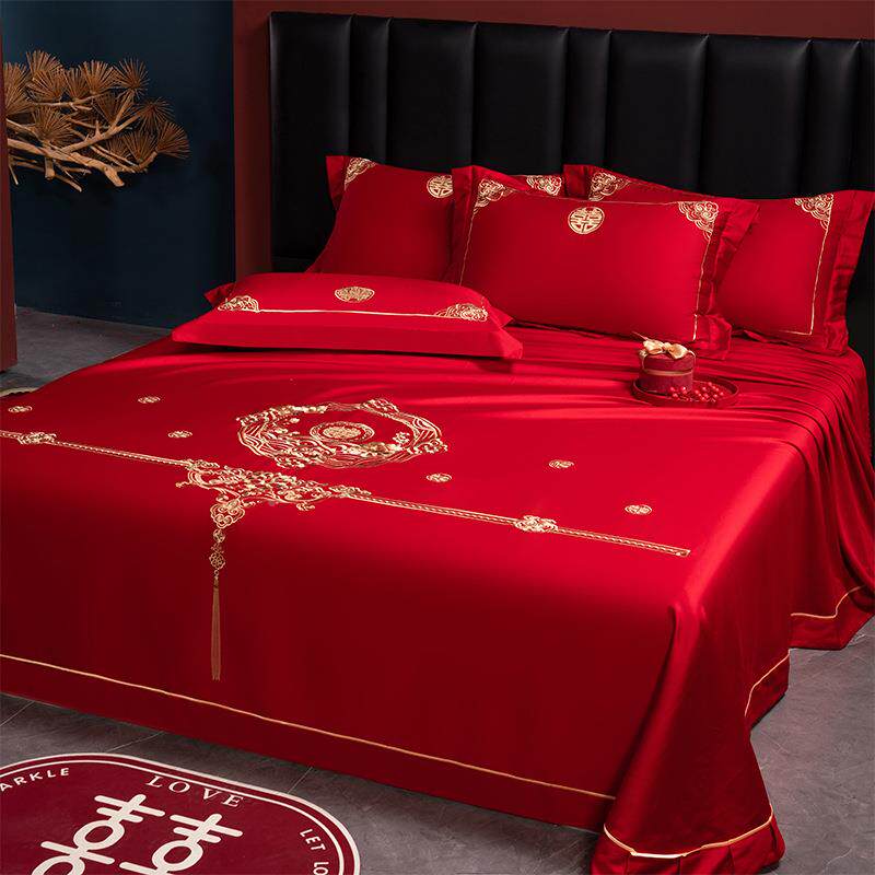婚庆结婚大出红色刺纯棉单女方11093/11床单单件酒店被枕套三件套