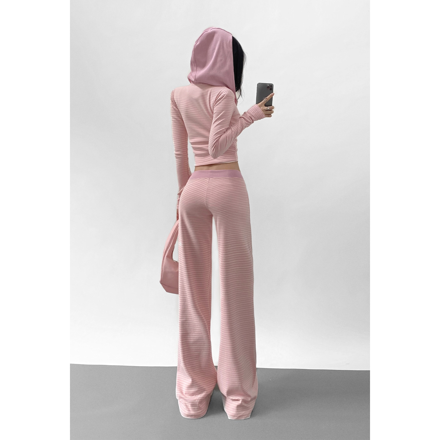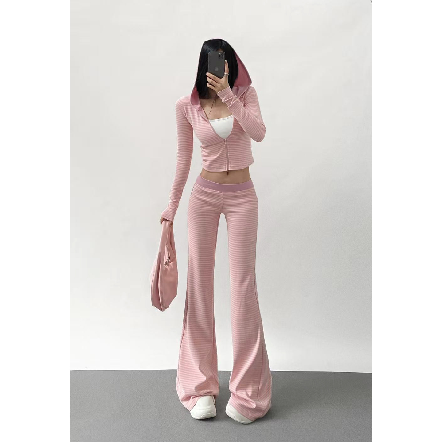 25秋纯欲辣妹条纹拉链连帽卫衣短外套微喇长裤两件套百搭运动套装