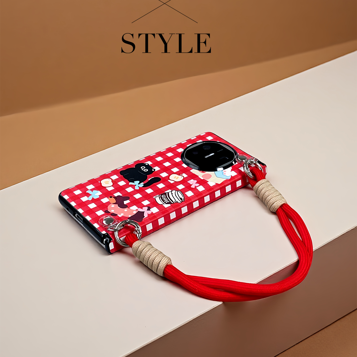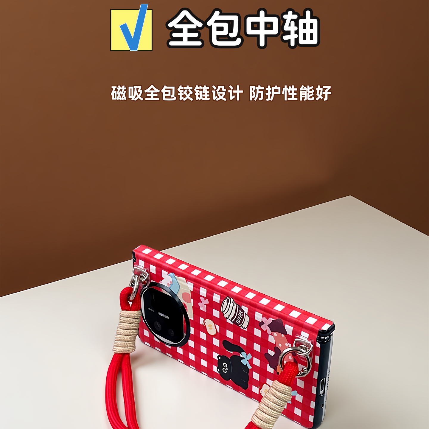 适用华为matex6手机壳可爱红格子vivoxfold5卡通X5女荣耀MagicV5全包中轴OPPOFindN5斜挎挂绳三星zfold7防摔